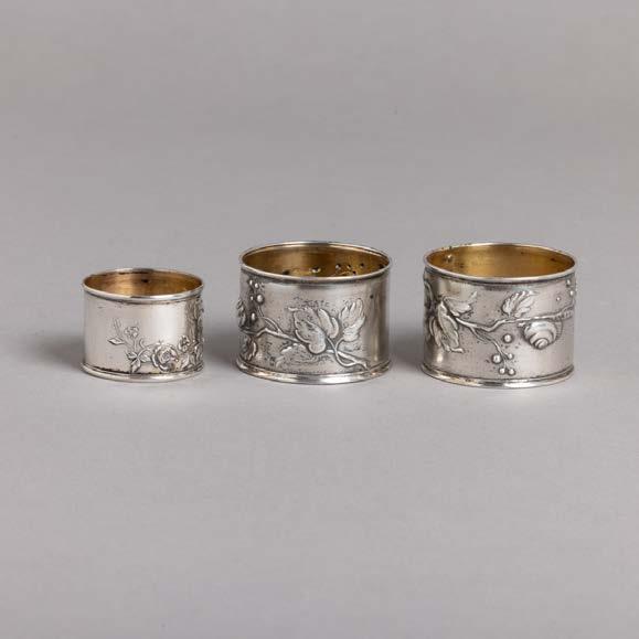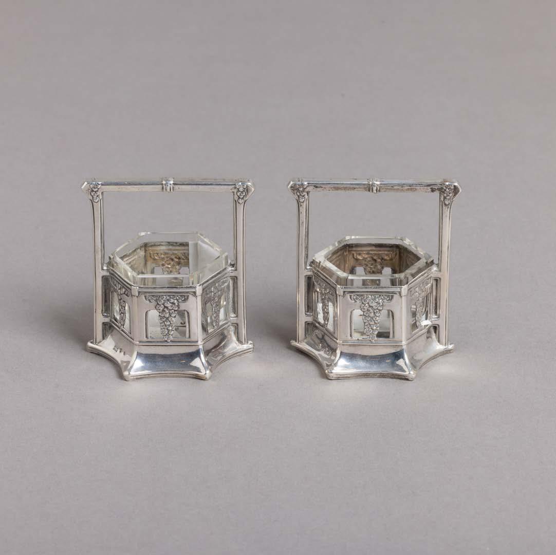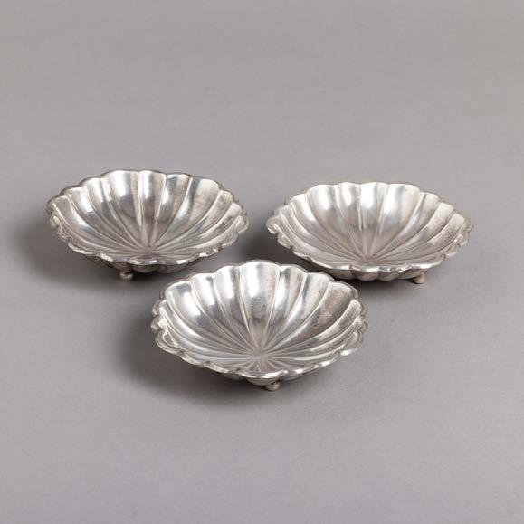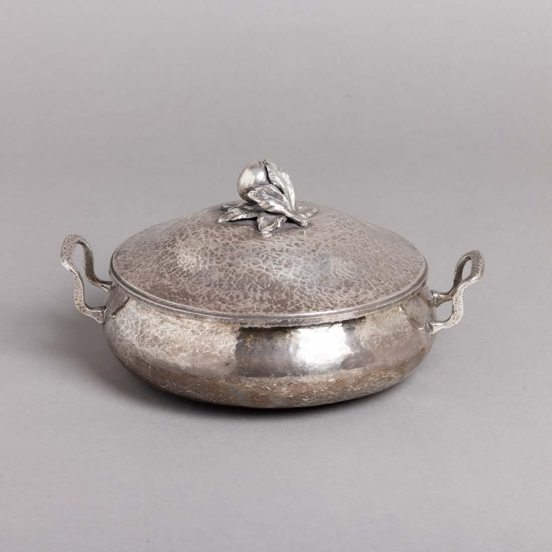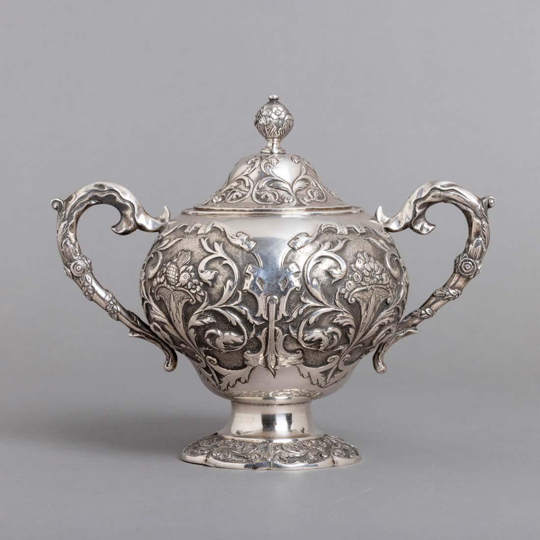 Em metal prateado, uma marcada Sheffield Collection, decoração gomada, recortada e gravada “motivos vegetalistas”, pegas com cabeças de leões. Uma com tampa diferente. Desgaste, pequenas amolgadelas e uma com soldaduras. Dim.: 14,5x13,5x12; 15x13,5x10,5 cm