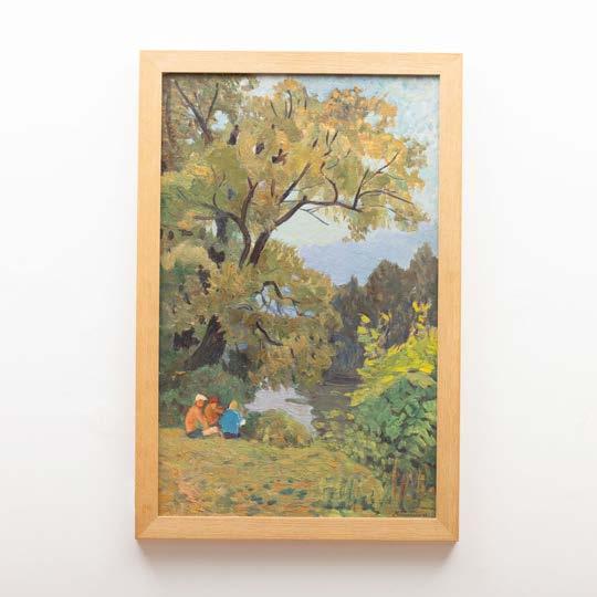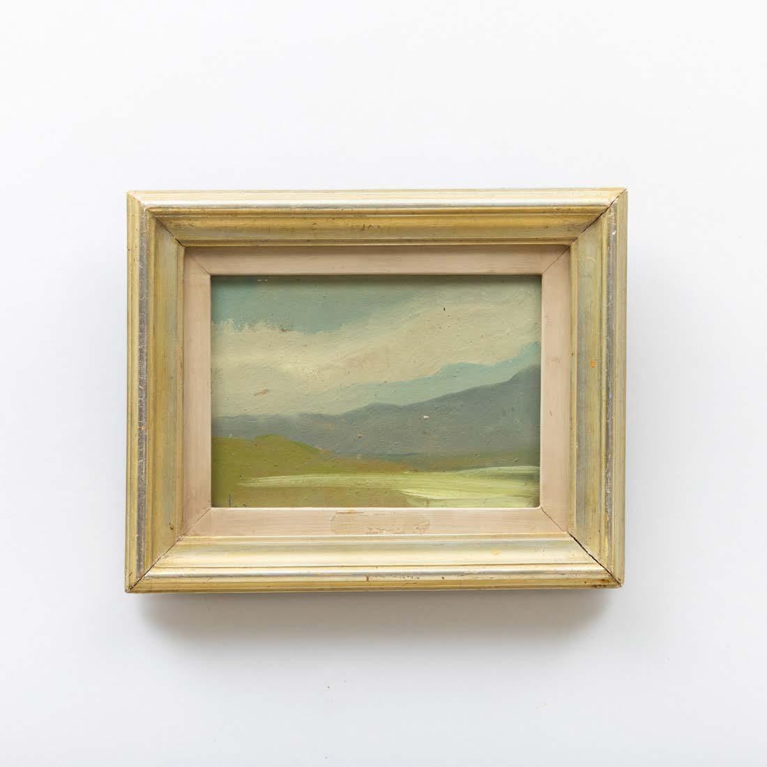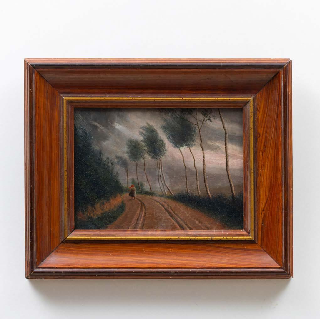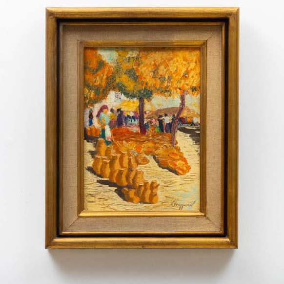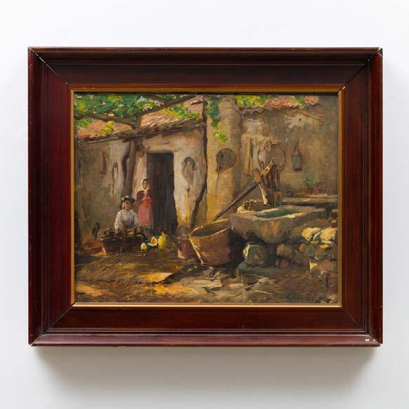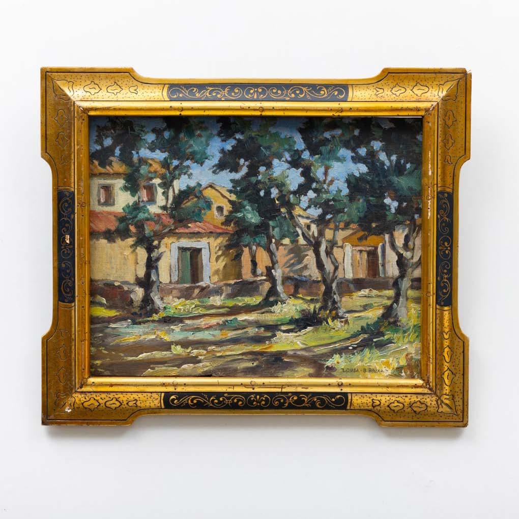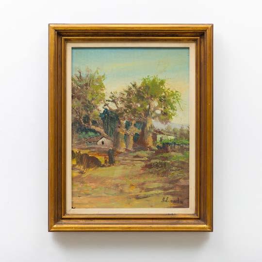 “Paisagem com casario e figura” Óleo sobre platex, assinado. Pequena falha no canto inferior esquerdo.