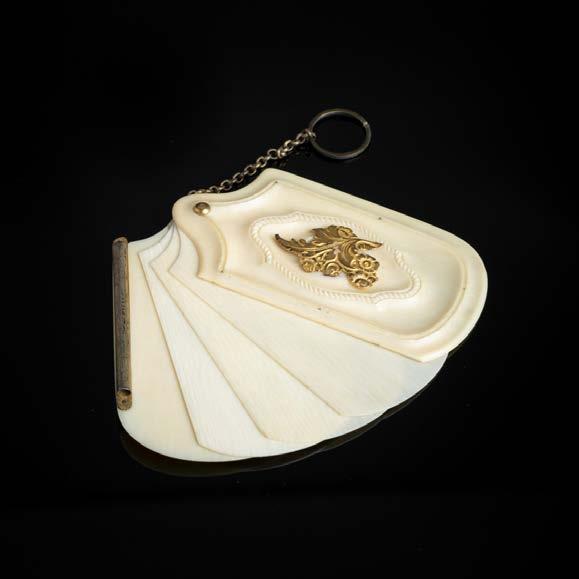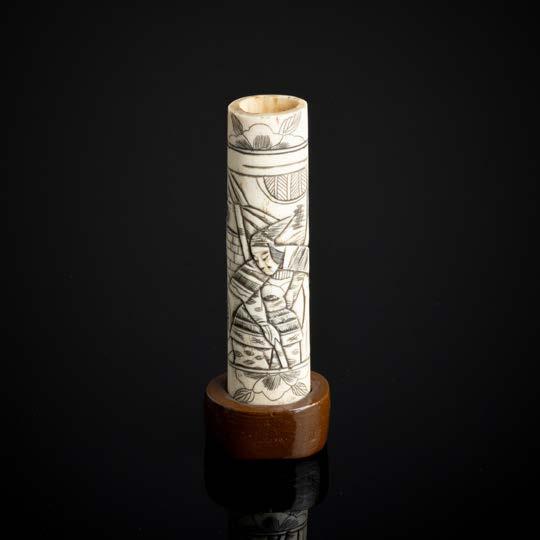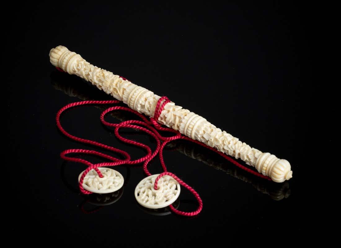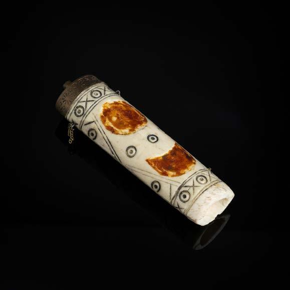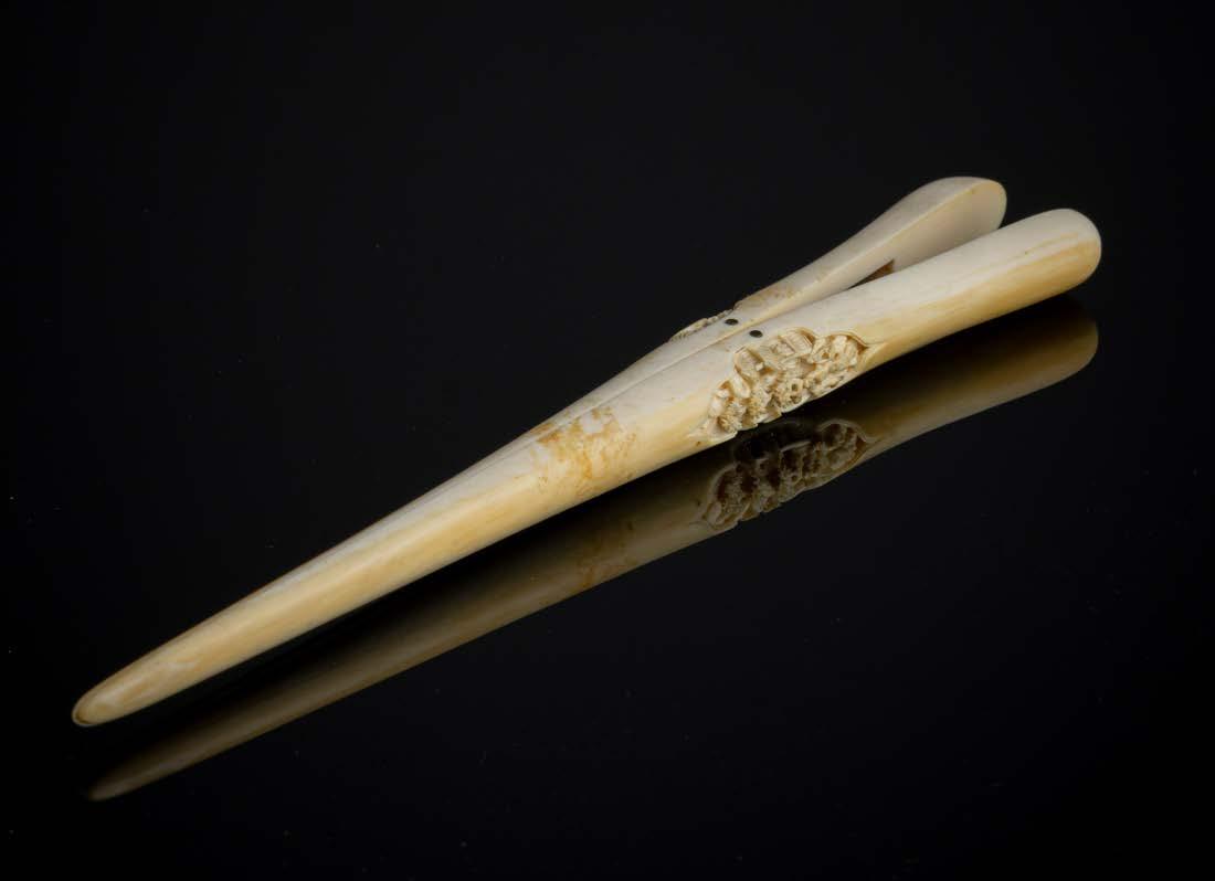 Esculpido em osso, decoração gravada “flores”. Sinais de uso e ínfima falha.