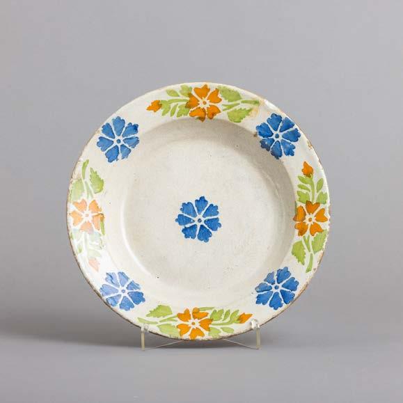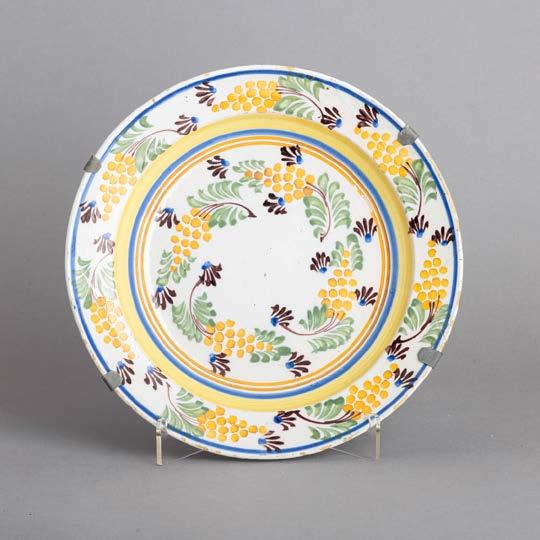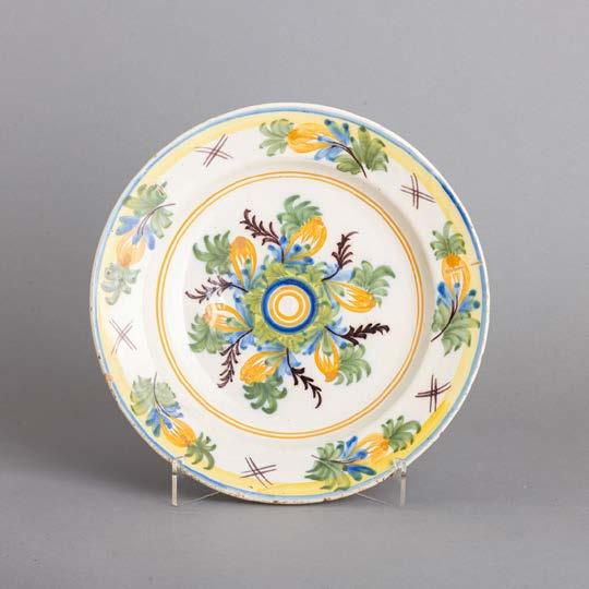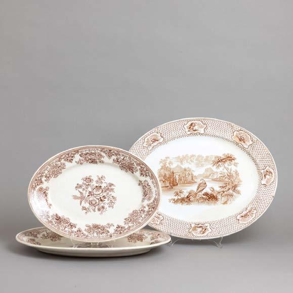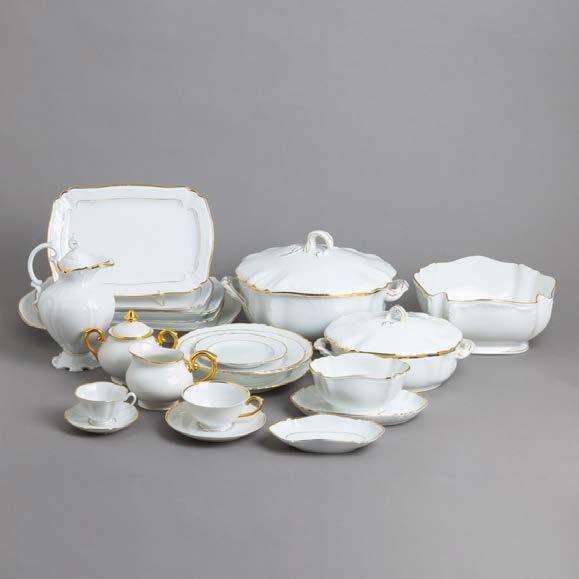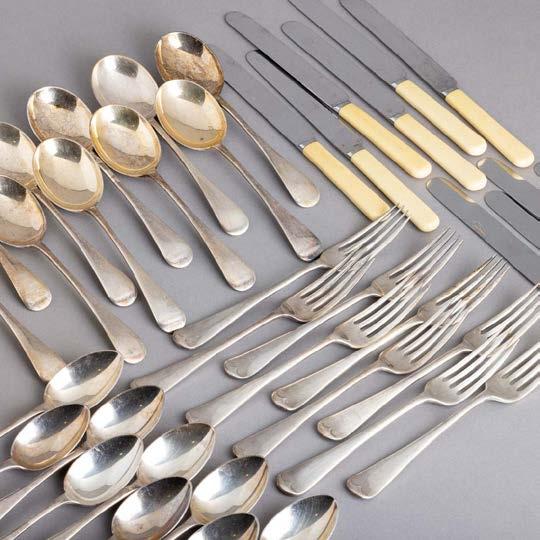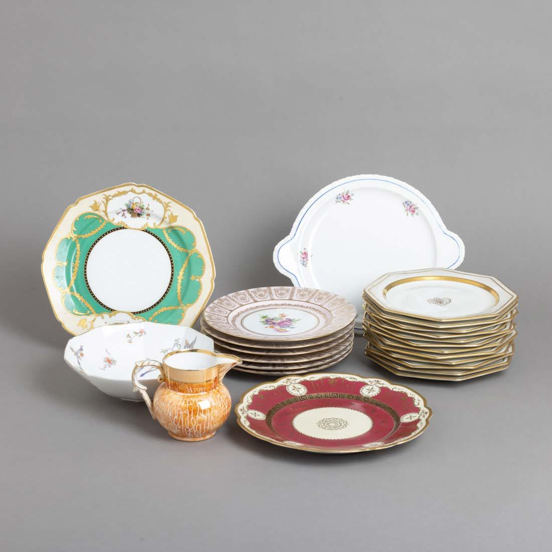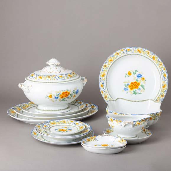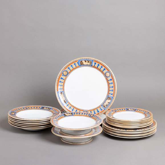 Em loiça pó de pedra inglesa, Minton, datado de 1864, decoração policromada no bordo com friso neoclássico. Composto por 2 pratos de servir, 2 pratos com pé, 6 pratos rasos, 6 pratos fundos e 6 pratos de sobremesa. Sinais de uso.