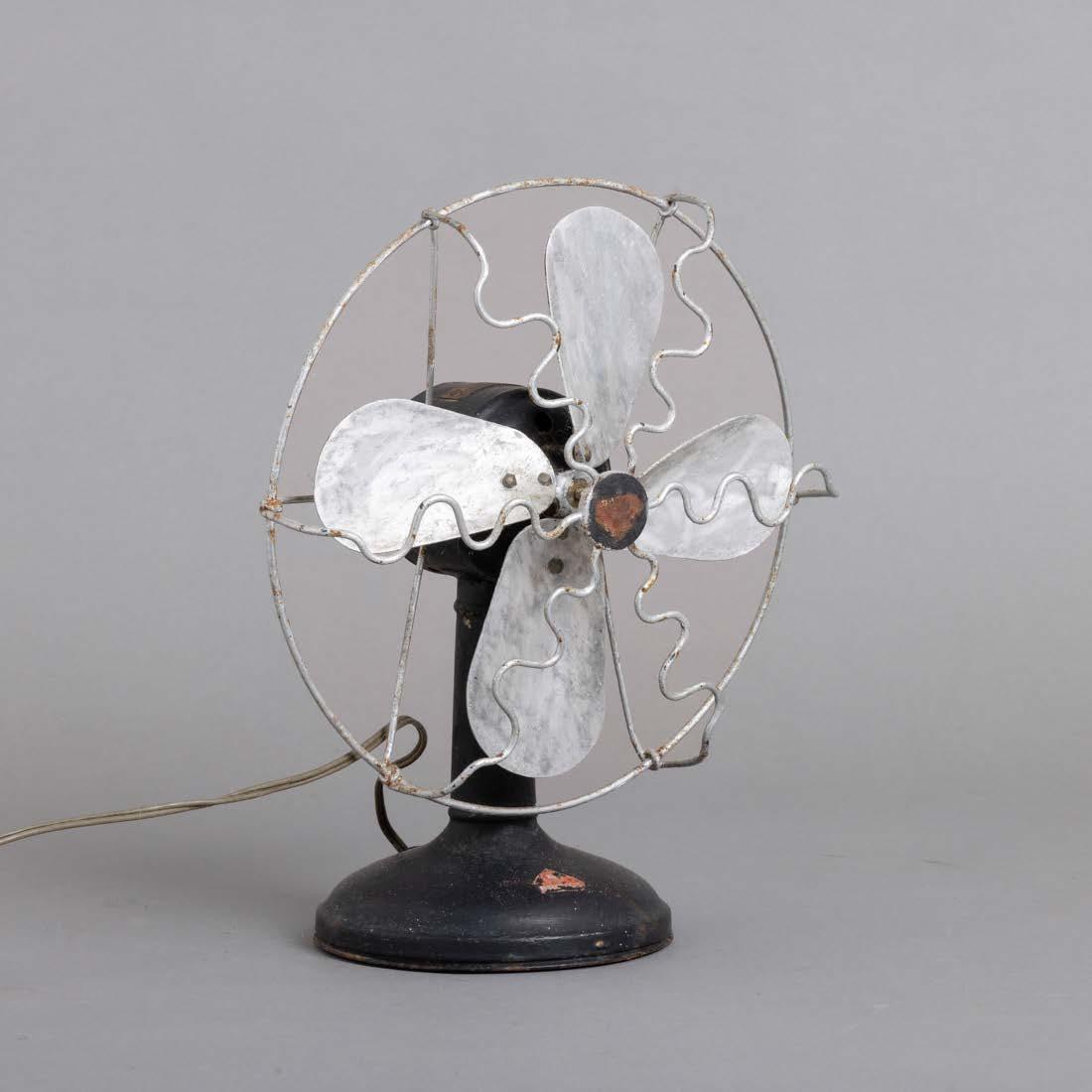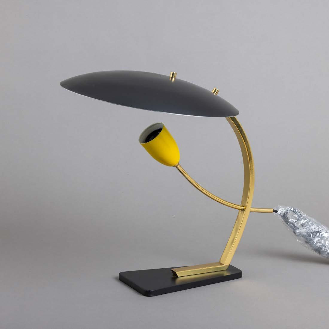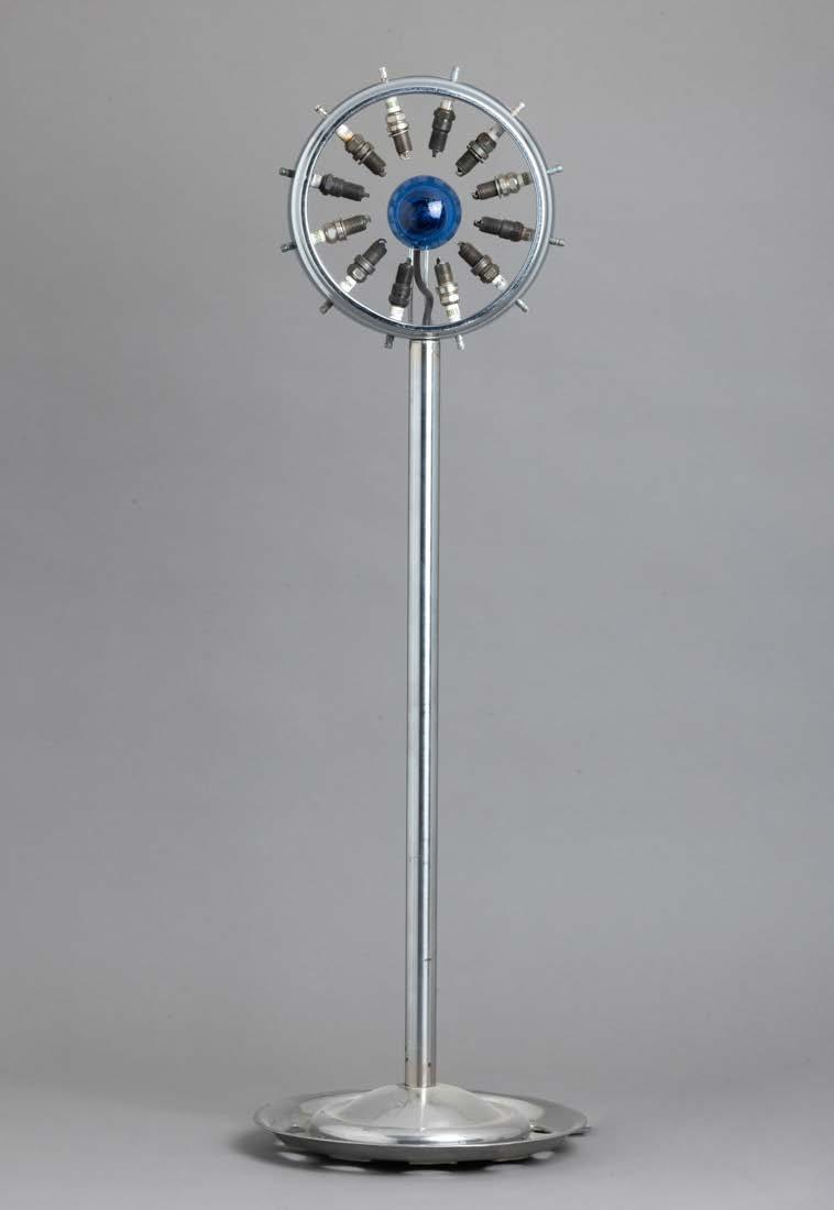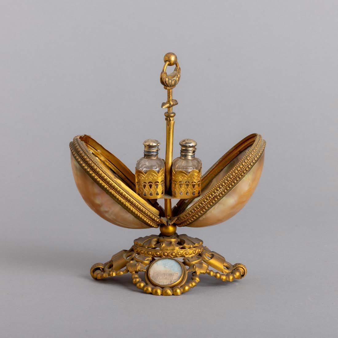 Em metal amarelo, com quebraluz e diversos utensílios, bases de formato circular. Sinais de uso, pequenos defeitos e manchas de oxidação.