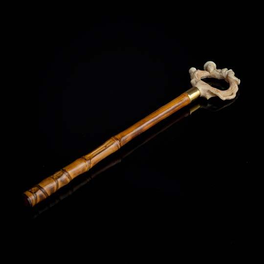Em cana de bambu com pega esculpido em osso, decoração relevada “figura oriental”. China. Sinais de uso.