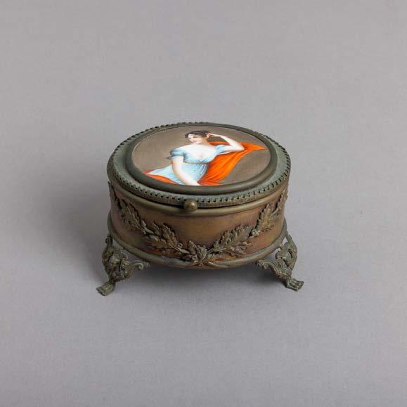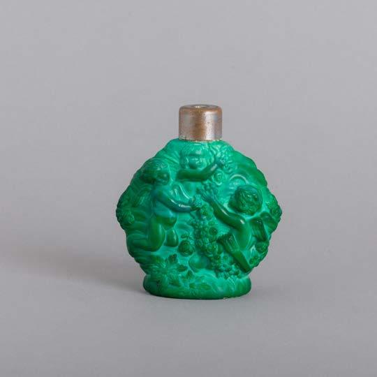 Em vidro verde simulando malaquite, decoração relevada “Cupidos”, design Heinrich Hoffmann. Boémia. Sinais de uso, aro com desgaste e falta tampa.