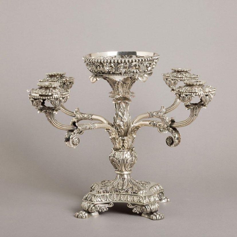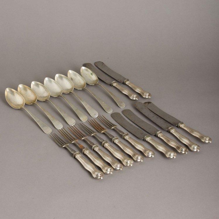 Em metal prateado, decoração gomada e relevada “elementos vegetalistas”, pomo com flor. Sinais de uso, pequenas amolgadelas e restauros.