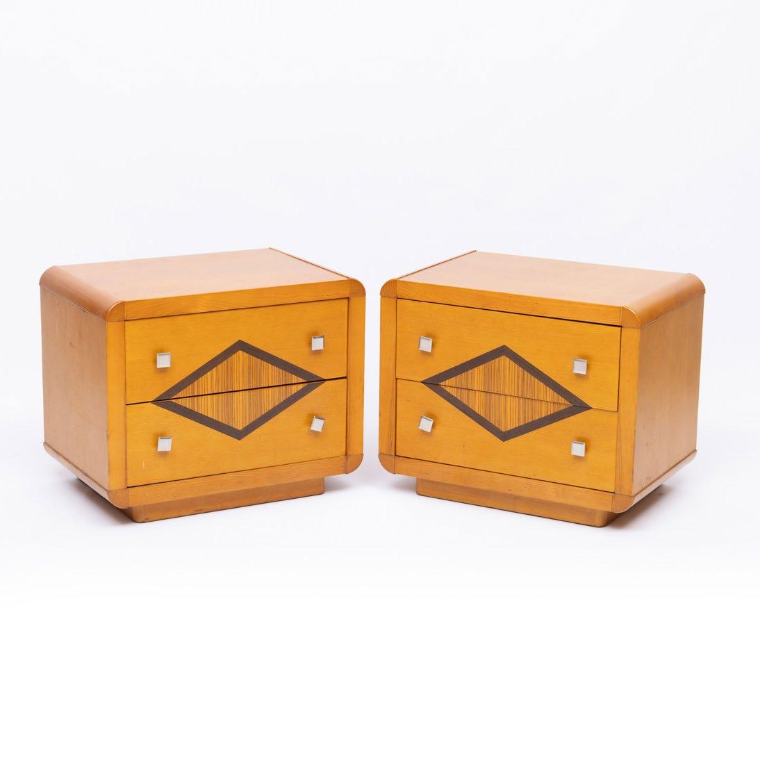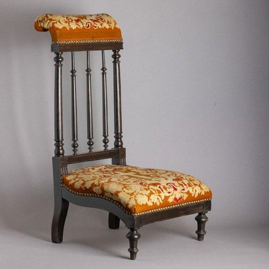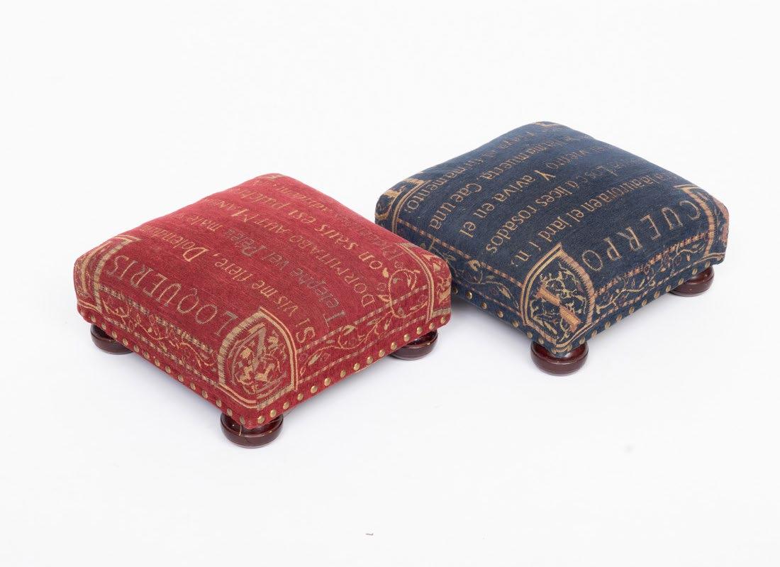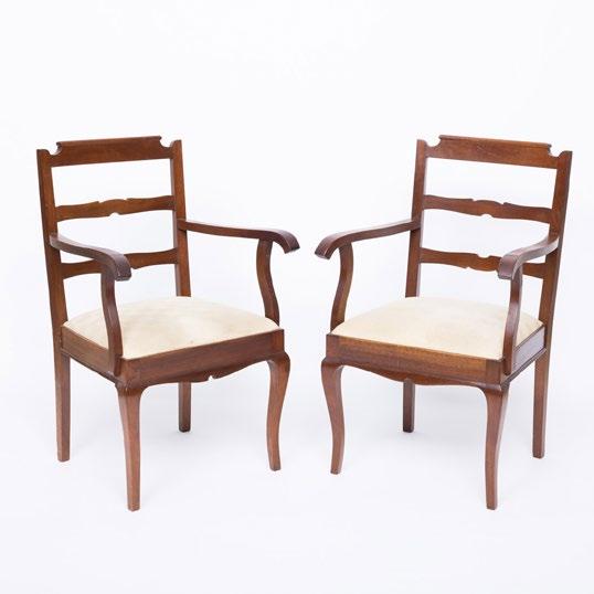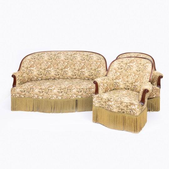 Estofados a tecido com pregaria, pés torneados. Sinais de uso e pequenos defeitos.