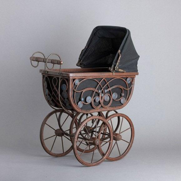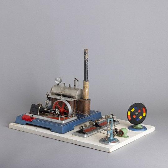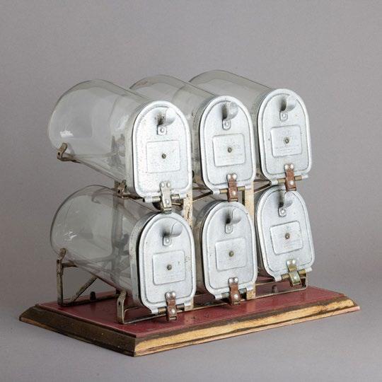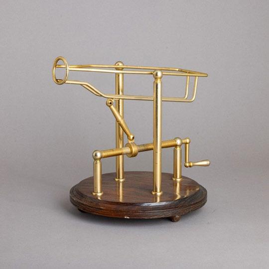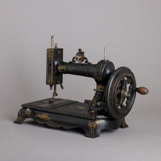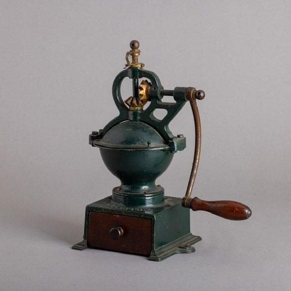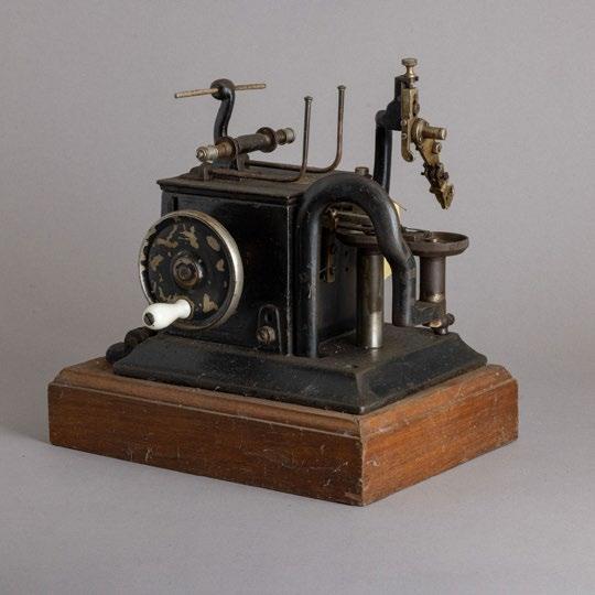 Em ferro pintado e base em madeira, manivela em porcelana. Marcada ‘Claes & Flentje’. Algumas falhas e oxidação.
