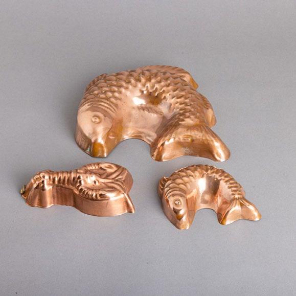 Em cobre estanhado no interior com argola de suspensão, decoração relevada com peixes e lagosta. Sinais de uso.