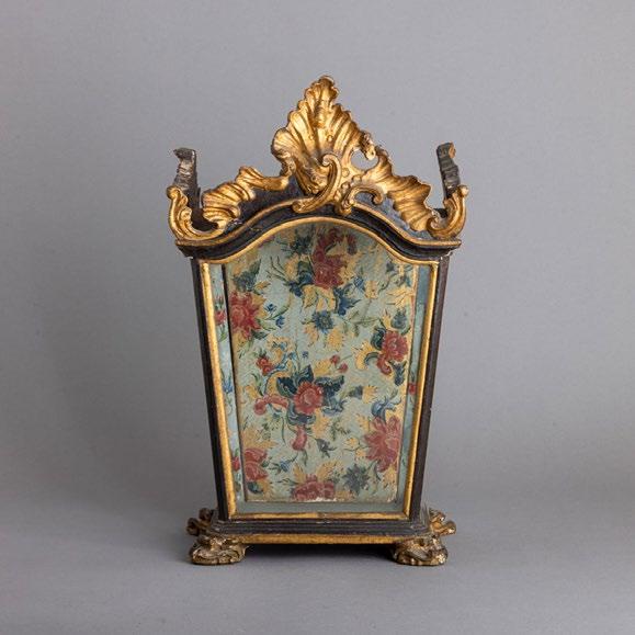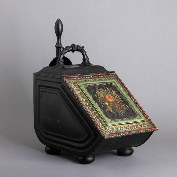 Em folha de metal pintada a negro, decoração policromada “flores”, pá com pega em madeira. Europa Séc. XIX/XX Sinais de uso, pequenos defeitos e oxidações.