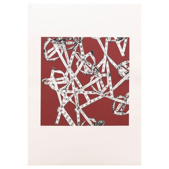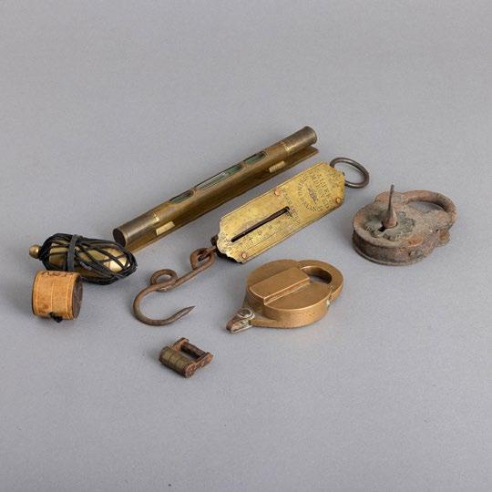 Composto por três cadeados, fio de prumo, nível e balança, em diferentes metais e outros materiais. Sinais de uso e algumas oxidações.