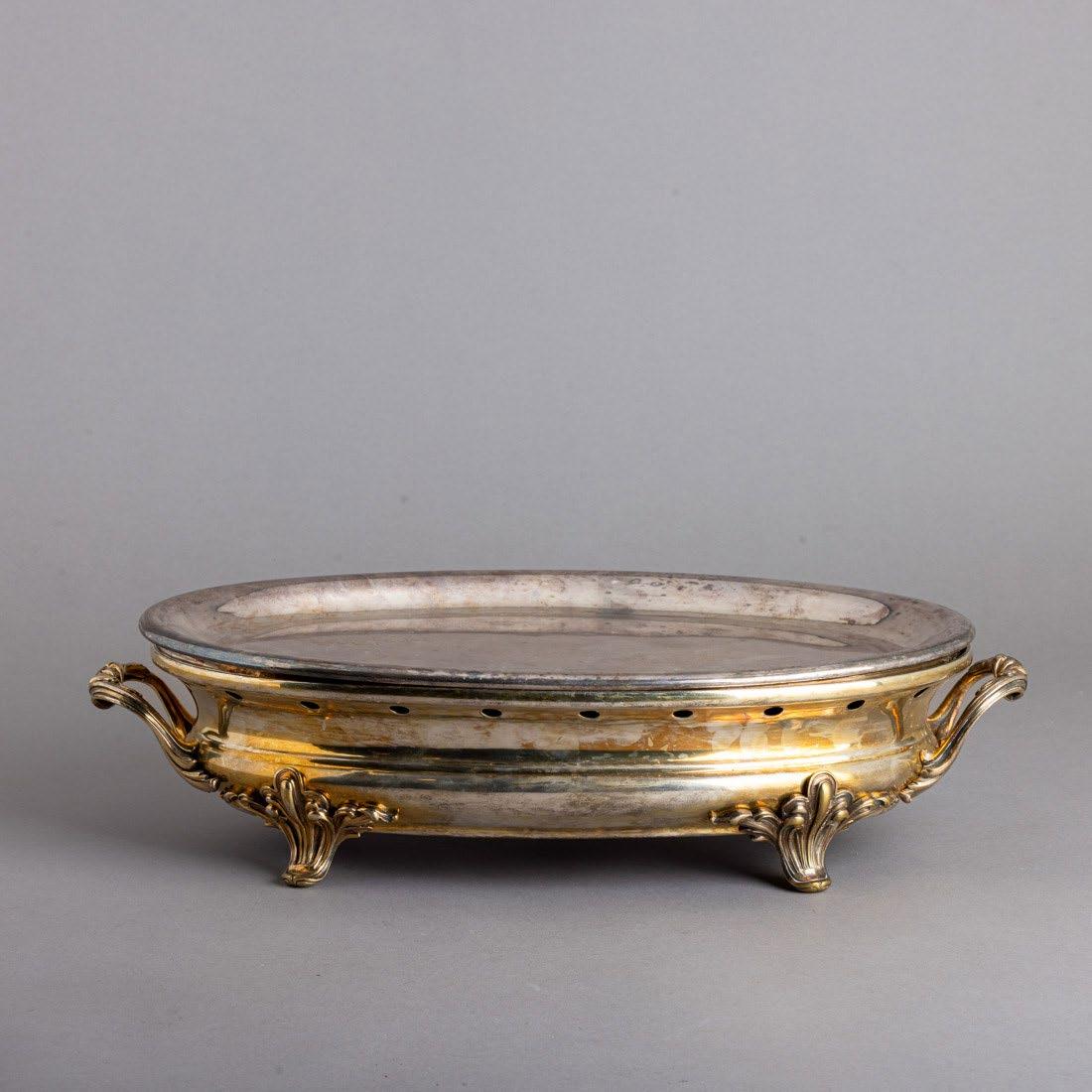 De grandes dimensões, em cobre, pega da tampa e asas em latão. Com a grade interior. Sinais de uso e pontos de oxidação.
