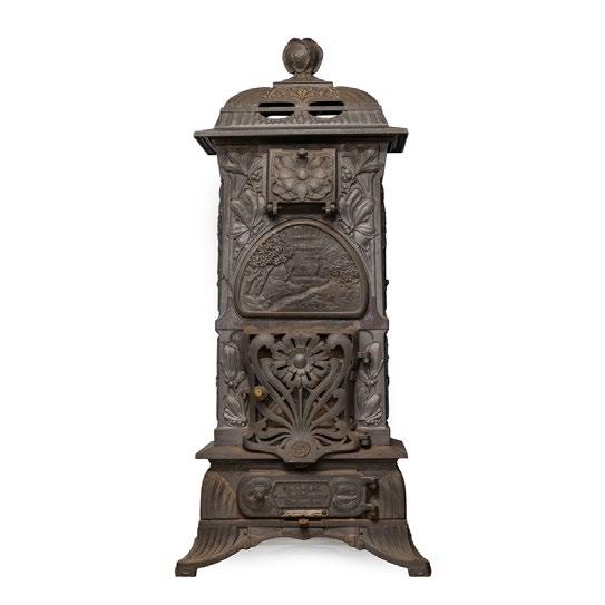 Em ferro fundido, decoração relevada e vazada “flores e paisagem com moinho”. Sinais de uso e pequenos defeitos.