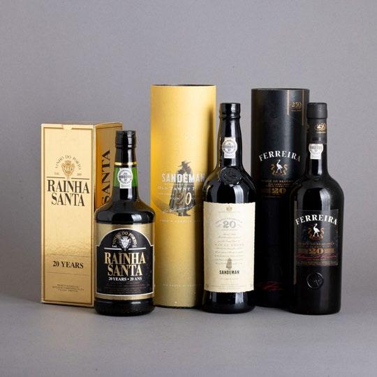 PORTO SANDEMAN 20 ANOS, DUQUE DE BRAGANÇA 20 ANOS E RAINHA SANTA 20 ANOS Três garrafas 750ml, caixas originais.
