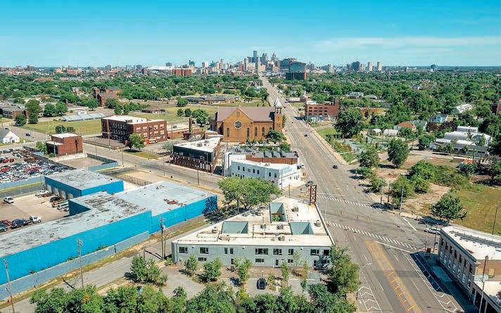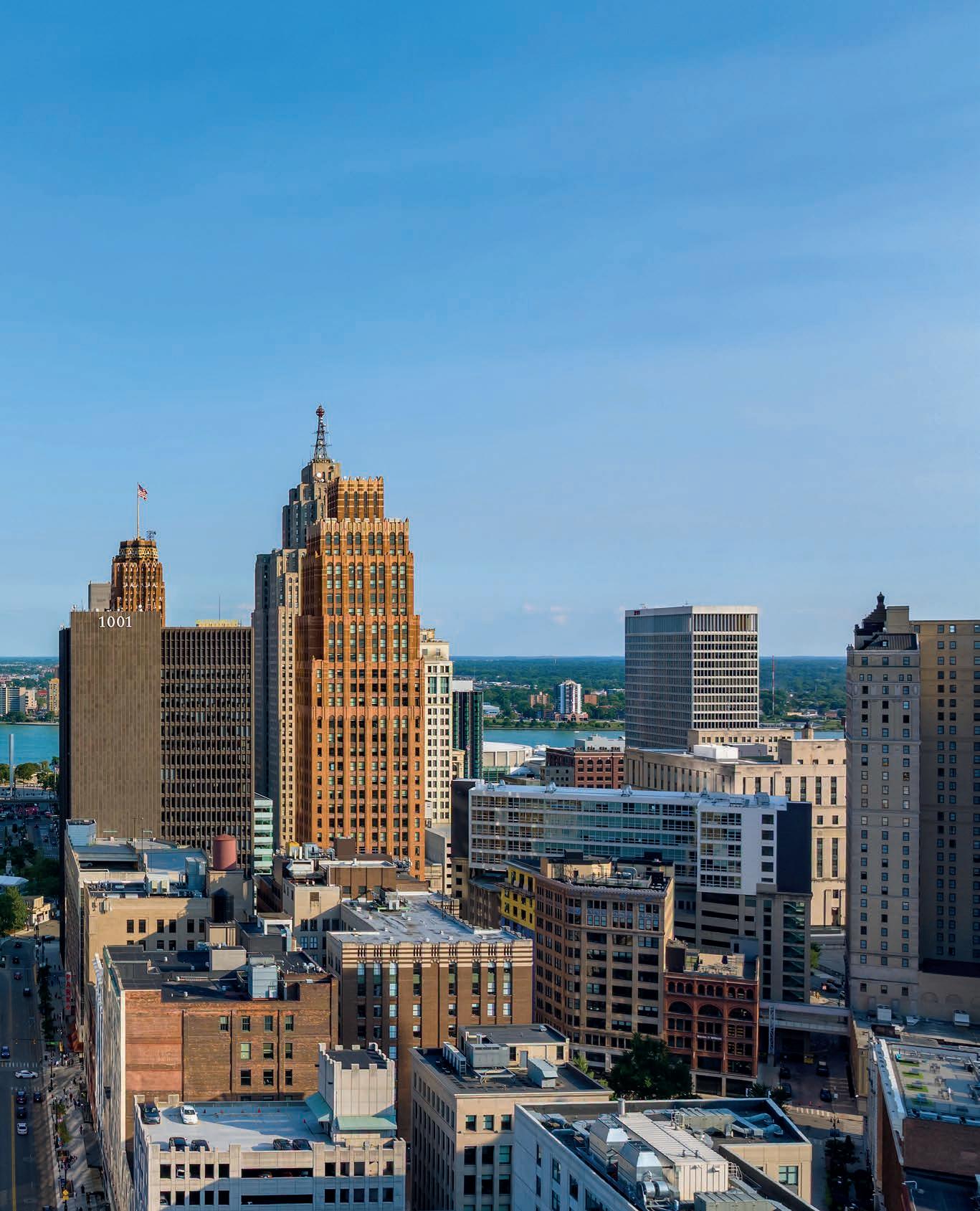 A new generation of developers has taken a di erent tack, focusing on Detroit’s historic fabric rather than building over it. Chief among them is Detroit-born billionaire Dan Gilbert, whose firm Bedrock has acquired and renovated more than 100 downtown buildings – nearly 1.7 million square metres of floor space in a district less than two square kilometres.