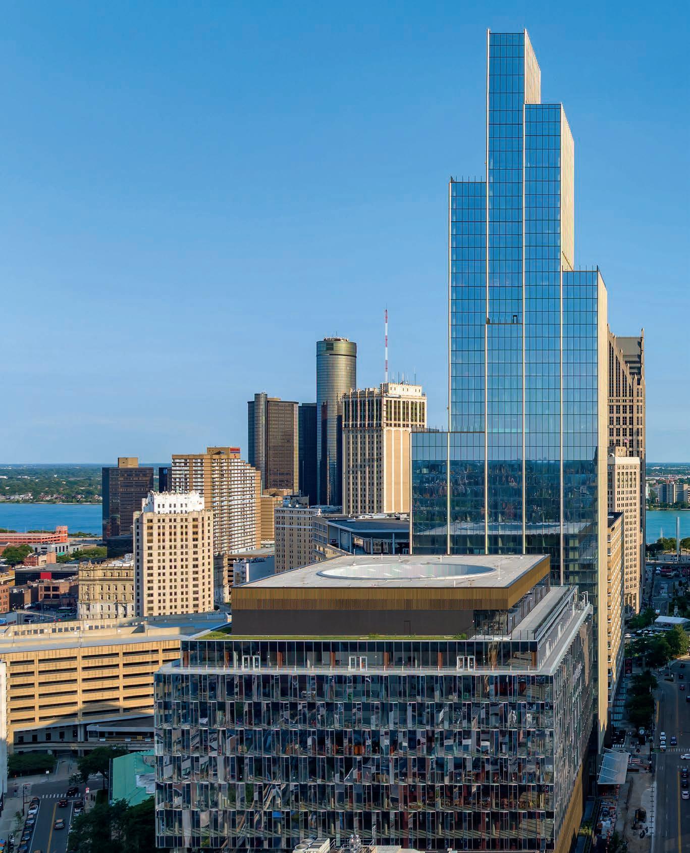 Though the curtain glass of the new tower bears little resemblance to its namesake, SHoP has included several elements that make reference to the visual flair of old Detroit, including terracotta cladding on the complex’s lower floors and a skylight inspired by the headlights of a 1954 Corvette.