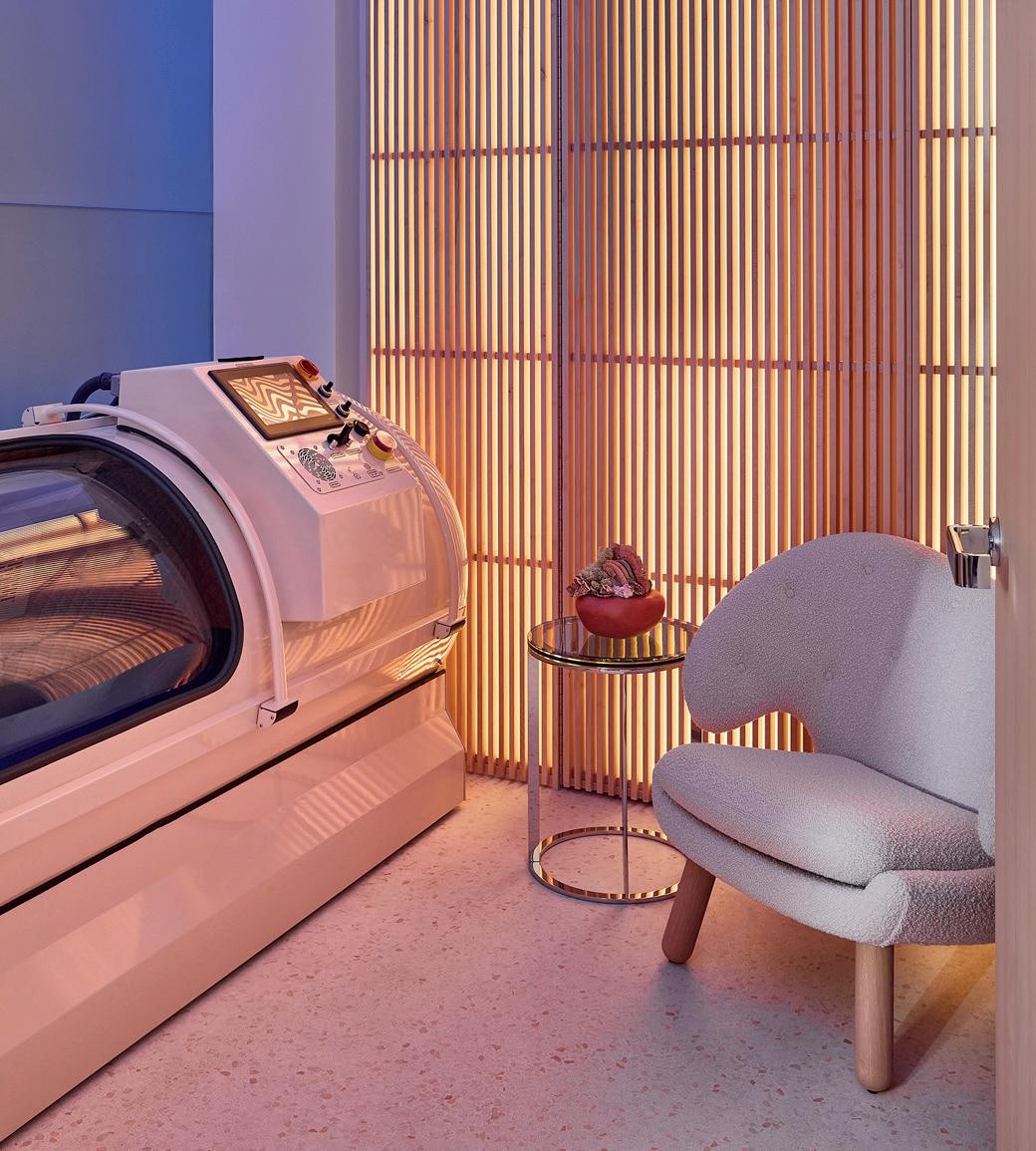 Surrenne’s spa and medical clinic features solar sculptures, soft pink lighting, mushroom artwork and crystals. The spa’s reception and retail space retail top-end wellness products ranging from energetically charged perfumes and VR goggles to workout gear and skincare tools. Behind this is a hyperbaric oxygen chamber suite and a diagnostics room.