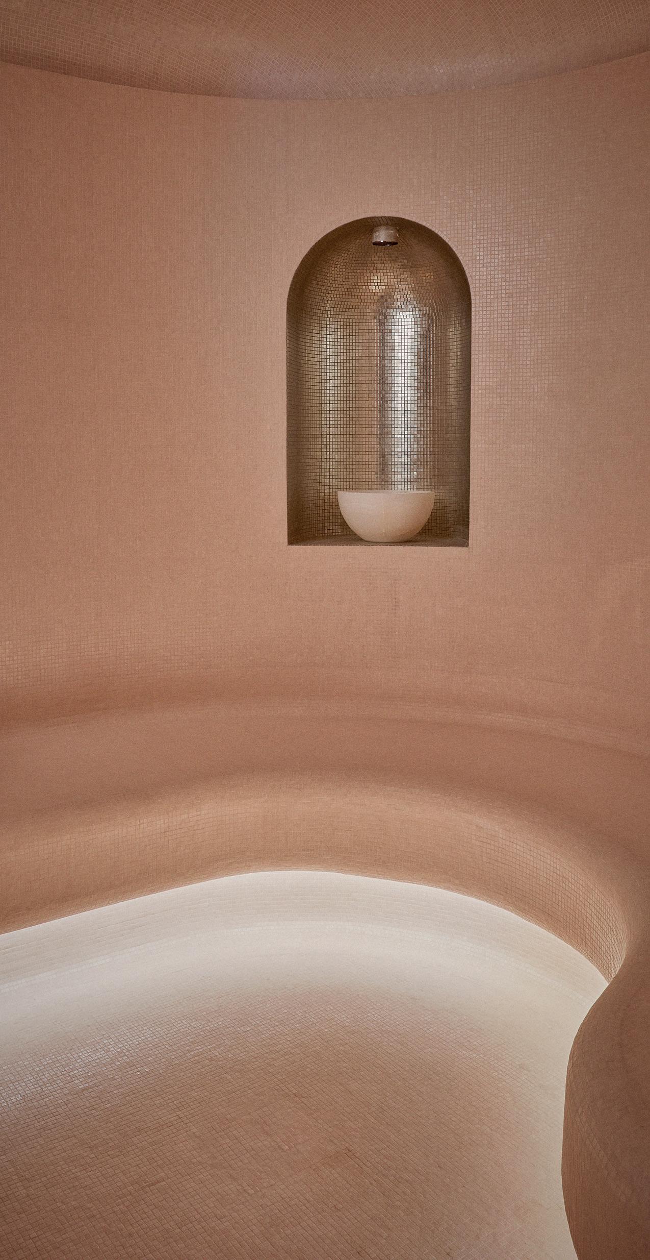 Around the thermal pool are a sauna and an aromatherapy steamroom with a pink glass portal. The standout feature, however, is a snow shower which provides a refreshing finale to contrast bathing cycles.