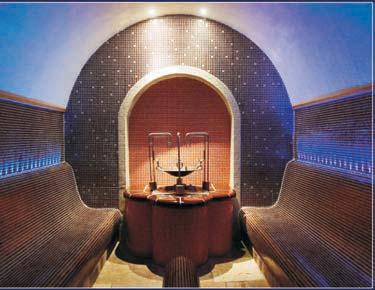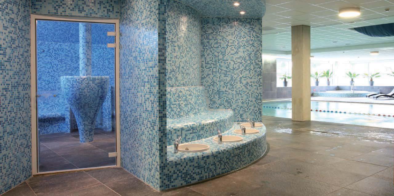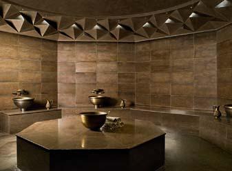Steam Bath is a steamroom for therapeutic mud ceremonies. Its special ceramic tiles keep their warmth and give off long-wave infrared heat to help calm the nervous system and provide optimum relaxation. Combined with mud, this results in a ceremony that can nurture the skin, purify the body and stimulate the metabolism. The tiles come in 19 different glazes and a range of sizes. The floor has been designed so that mud and water drain off easily.