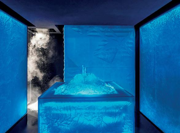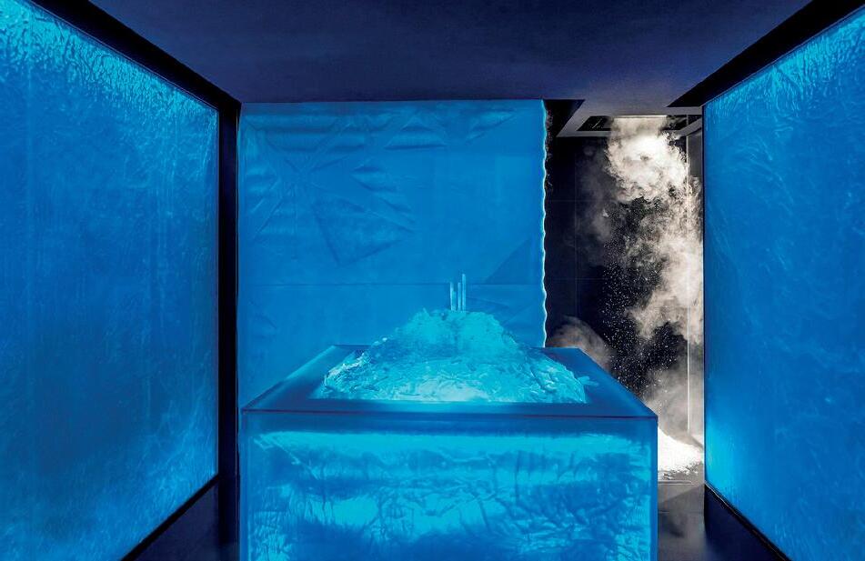 Frimas experience rooms are cooled to between 0-5°C by arctic-inspired ice walls called Glacier. These can be customised in size, feature blue backlit acrylic blocks and generate a fine ice steam infused with a mint aroma.