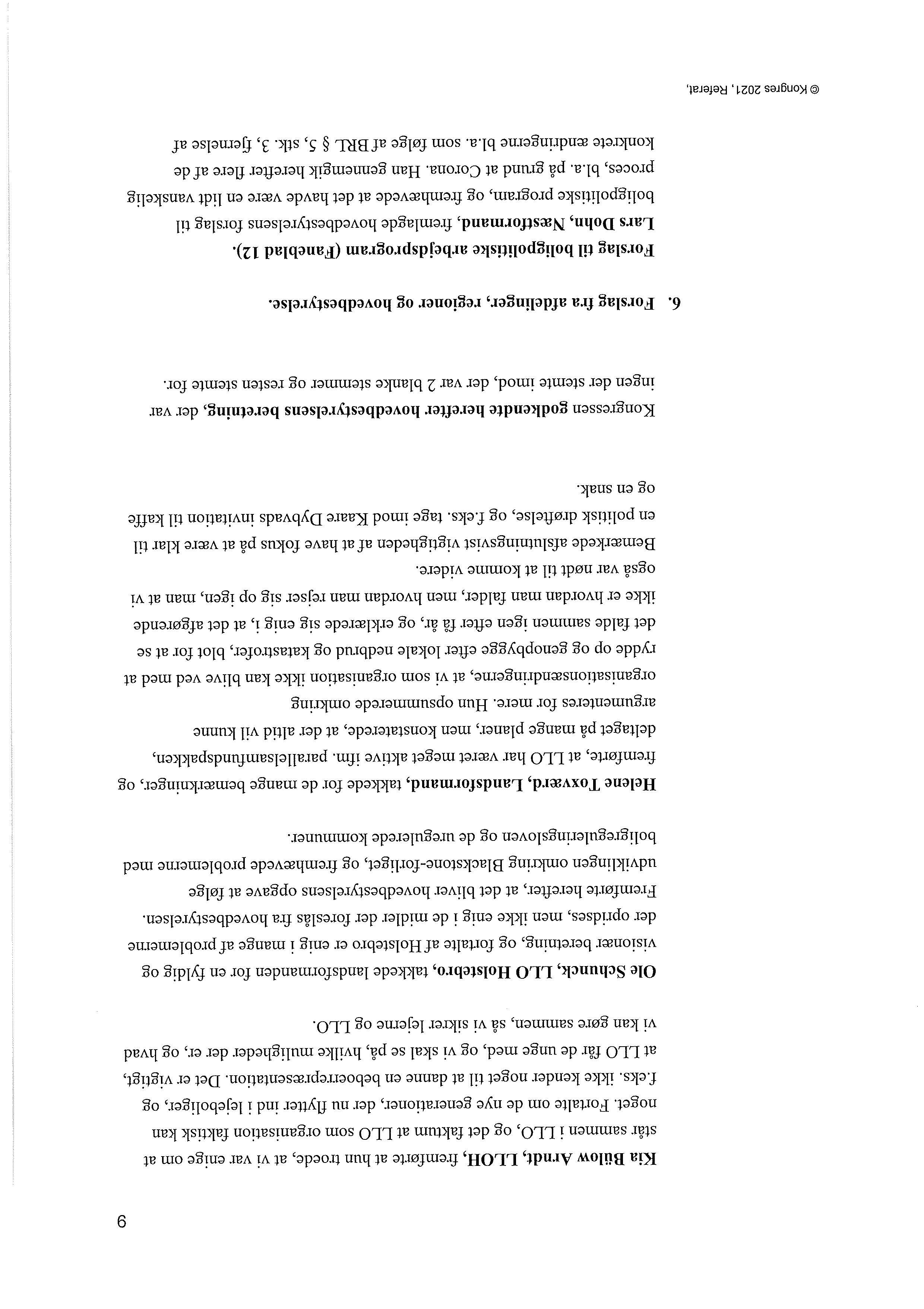 Herpåsattesforslaget§6,stk.6,om præciseringafafdelingernespligttil atindkaldelandsorganisationen tilgeneralforsamlinger,tilafstemning Afstemningenforegikvedhåndsoprækning. Forslagetblevenstemmigtvedtaget.
