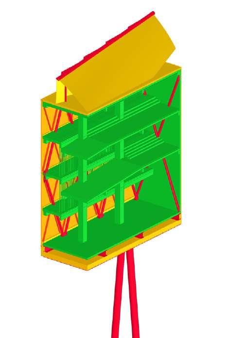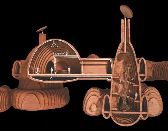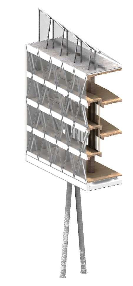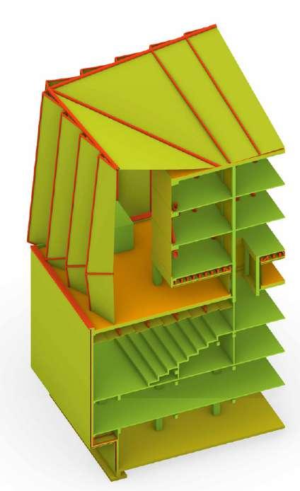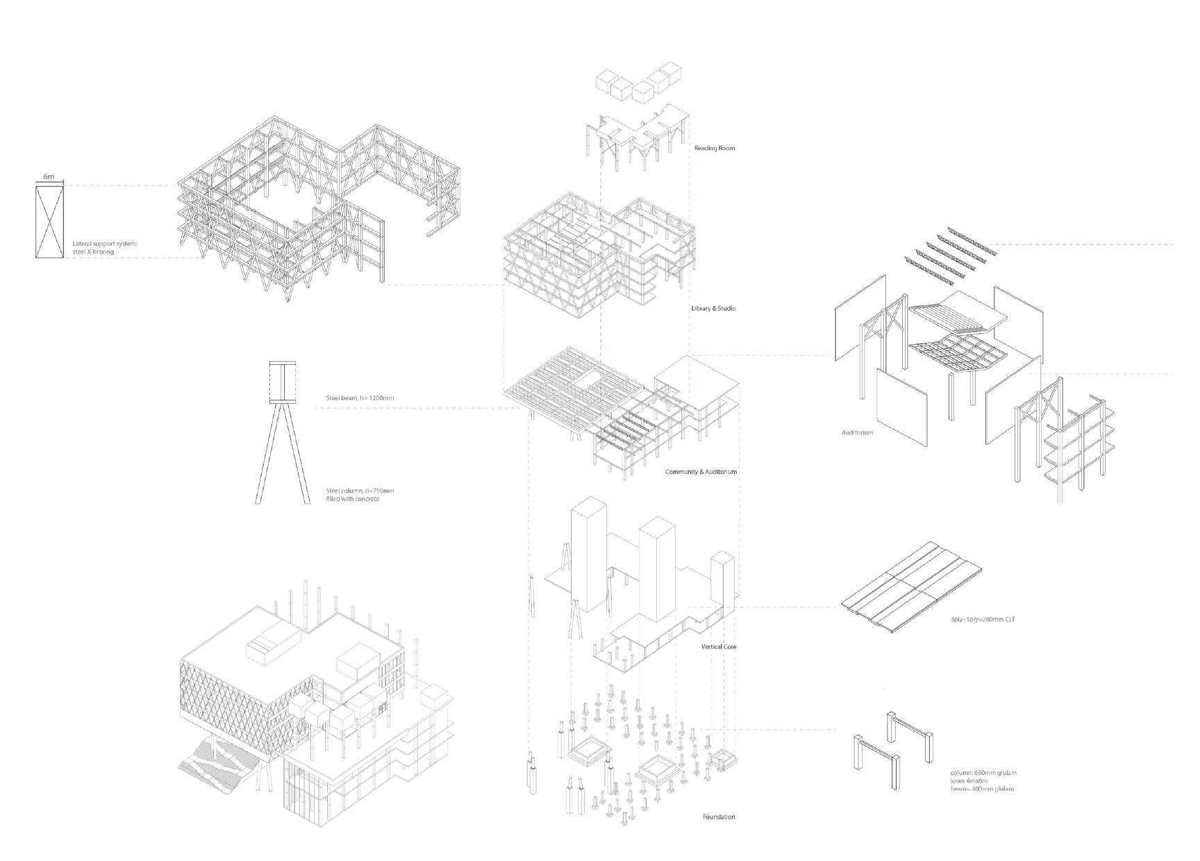 For material selection, use low embodied energy material as much as possible to reduce environmental impact. Only a small amount of concrete is added where it is essential to the structure.