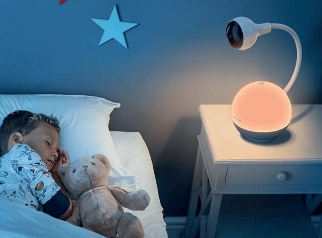Clever features such as portable baby units, Wi-Fi on/o control, anti-feedback audio, lullaby-only baby mode, and auto-dimming lights simplify parenting. Distinctive design, sturdy materials, exible mounting, and a secure app platform deliver peace of mind.