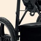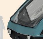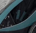 With rear suspension and pneumatic wheels, it offers a comfortable ride for children, even on rough terrain. The ergonomic two-seater provides plenty of space and features a height-adjustable 5-point harness system for safety. The large storage compartment holds all essentials. New brakes provide extra legroom, and the height-adjustable handlebar and swivel front wheel make maneuvering easy. The trailer folds compactly with one hand, making transport simple and convenient.
