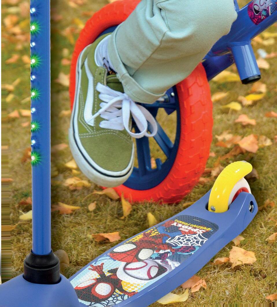 For fast paced fun, the Tilt and Glo Scooter adds serious wow factor to three-wheel scooters. Responsive tilt and turn steering helps young riders build coordination naturally, while the wide footplate offers a stable platform for early scooting. The multi coloured light up wheels create movement driven theatre, complemented by a push button activated light up stem featuring seven different modes. The result is a feature rich scooter that feels exciting before it even leaves the shelf. Finished with vibrant character graphics across the anti-slip deck, it delivers strong visual impact in both boxed and assembled displays. Backed by the global power of Marvel storytelling and characters that resonate strongly with preschool audiences, the Spidey and His Amazing Friends range blends movement, imagination and collectability into a cohesive play story. For retailers, it offers a proven combination of licence strength, feature-driven design and standout shelf presence across wheeled, garden and indoor categories alike. that easy rides missions.