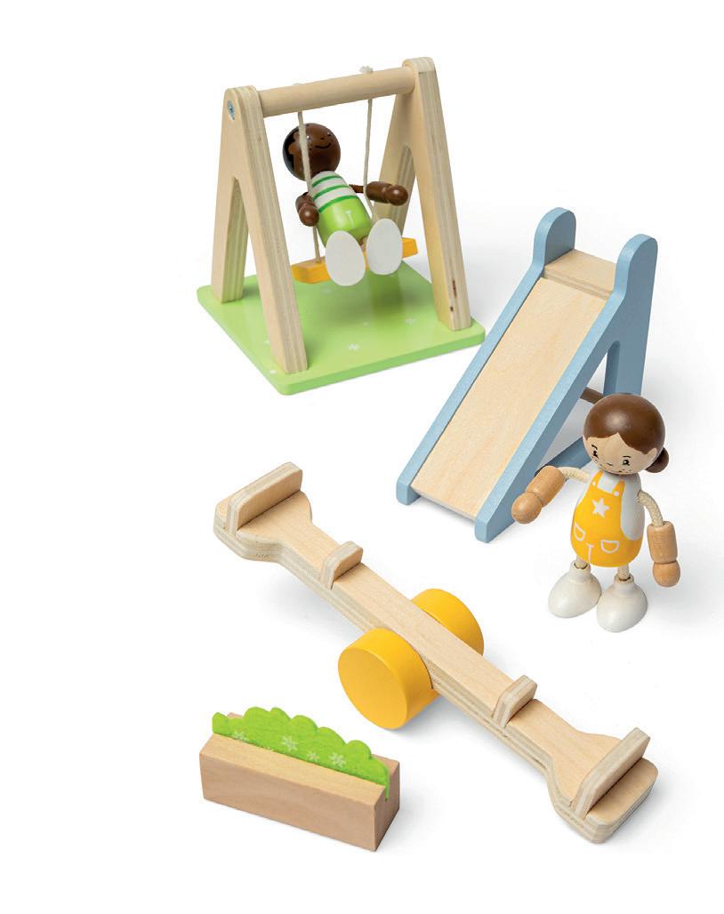 Crafted from high-quality, FSC-certified wood, the set features a working swing, a classic seesaw, and a floral hedge to decorate your doll’s outdoor space.