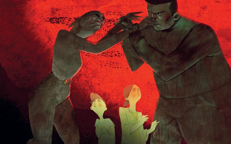community having a good time. As in the Grimms version, the four wanderers hatch a plan to get their hands on the delicious food – but the change of gender in this telling creates fresh curiosity about a fairy tale that praises teamwork and cunning for a good cause in black and white and a cold grey.
