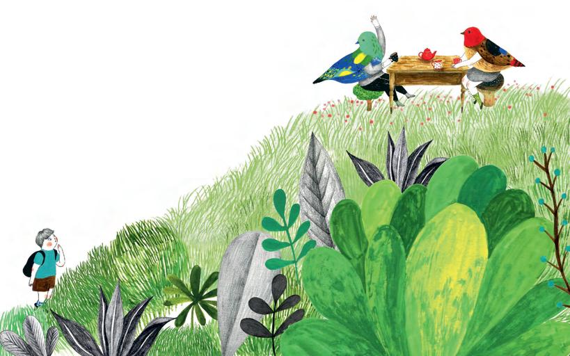 Illu 2: The little boy looked up at the hillside and saw the blue bird that had caught his attention earlier (the blue bird had turned into a Birdman with arms and legs), along with its companions, joyfully