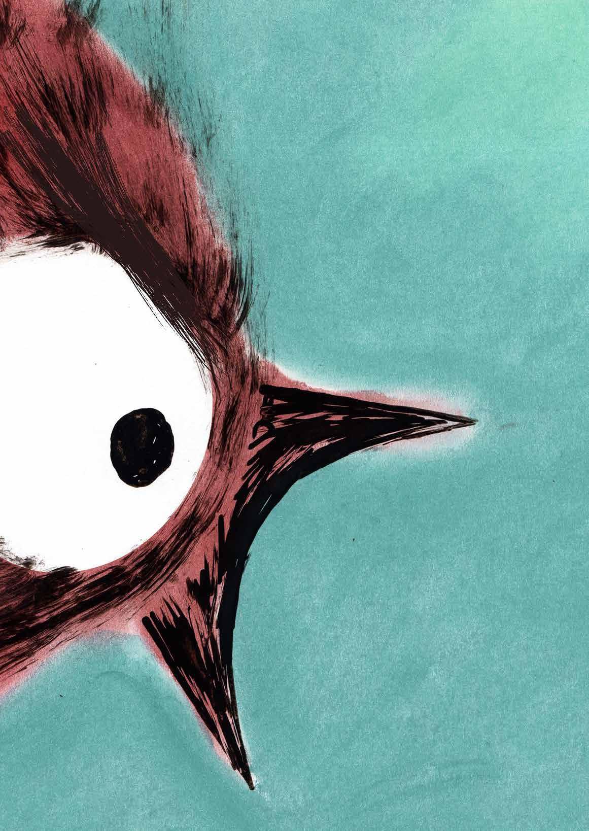 JURY REPORT Small. Black. Six legs. A pair of wings. Big eyes. Small proboscis. Definitely an insect. Which species? That doesn’t matter for the story. The small, not unlikeable, insect buzzes around, searching, finding and traveling. aaaaaau !, screams a red bird that has just had a small tuft of hair plucked out of it. But wait a minute. The bird isn’t screaming at all. It has its beak wide open and its eyes look like a loud, angry cry. But no sound comes out of its beak. Clara Gilod delights us with a silent picture book. No words, just pictures. Like in the caves of Lascaux.