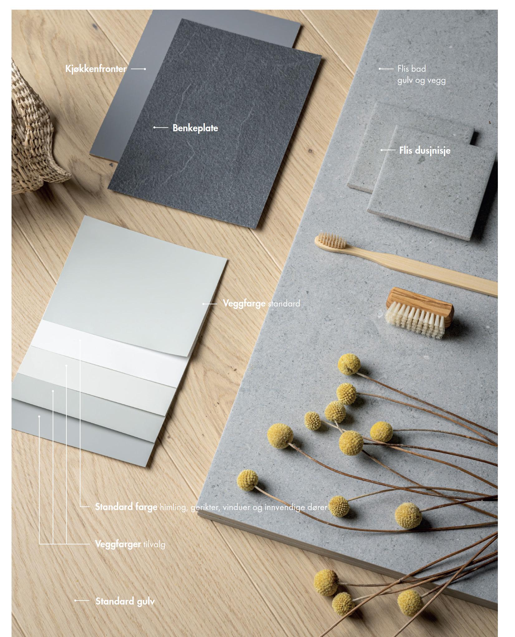 På de neste sidene vil du få en presentasjon av de ulike konseptene. Velg det konseptet som passer best til din egen smak og stil. Om du ønsker andre farger, kjøkkenfronter og fliser er det også mulig å få endret dette så lenge man kjøper tidlig i prosessen. Hør med oss hvilke endringer som er kostnadsfrie for akkurat den leiligheten du ønsker.