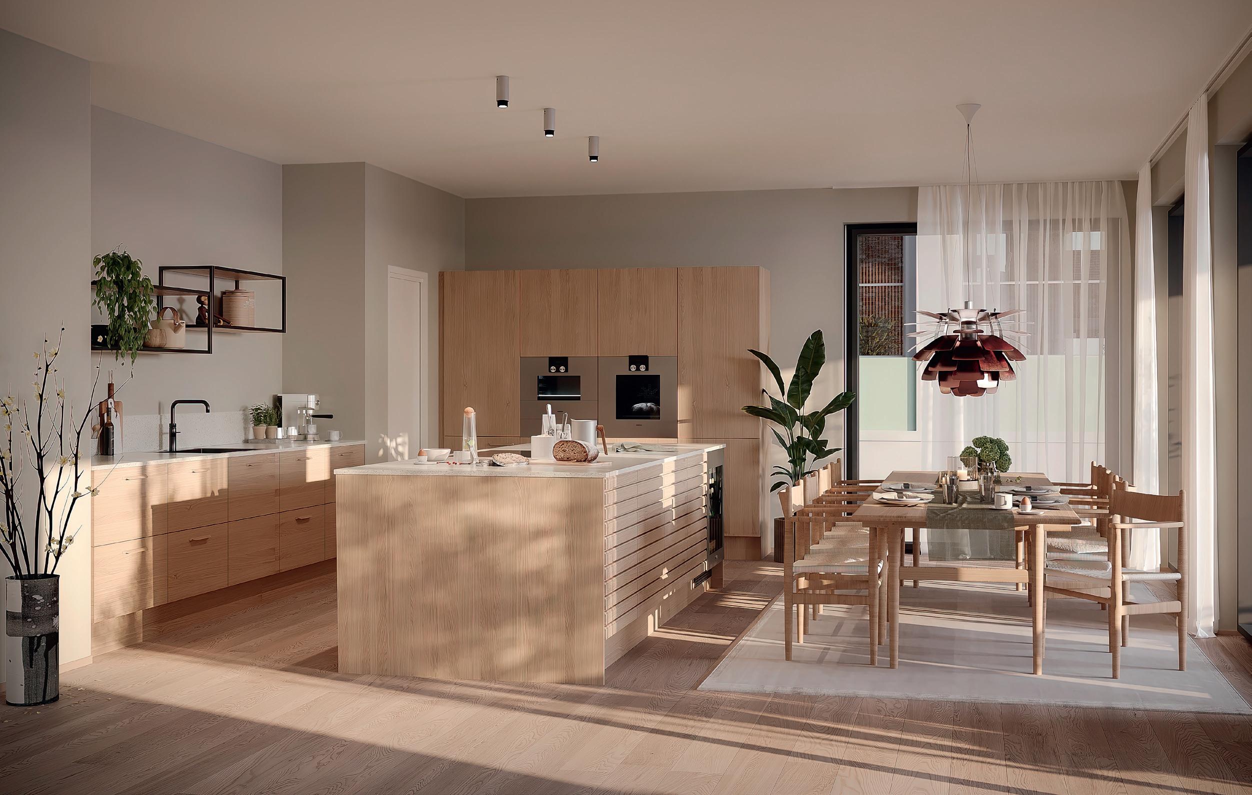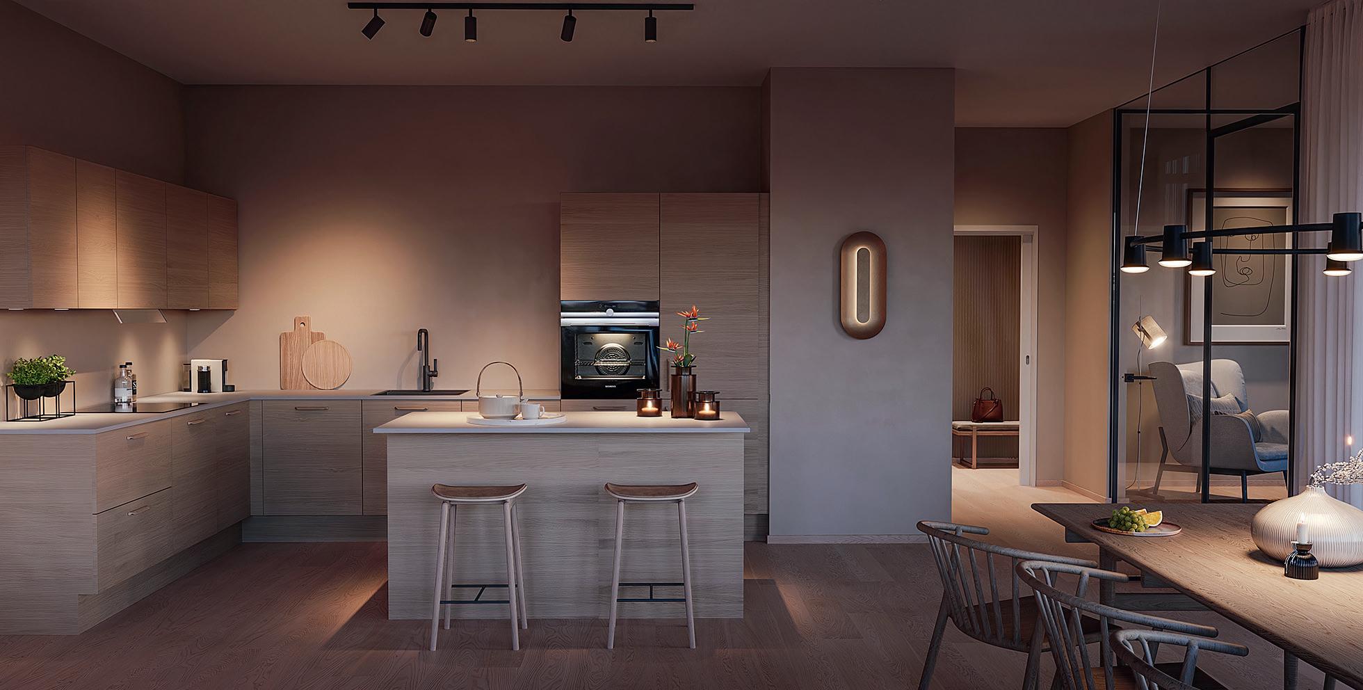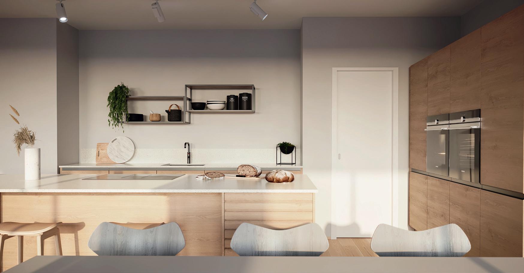 Alle leilighetene får åpen kjøkkenløsning som både skal være funksjonelt til matlaging og et elegant møbel som skaper trivsel og gode øyeblikk.
