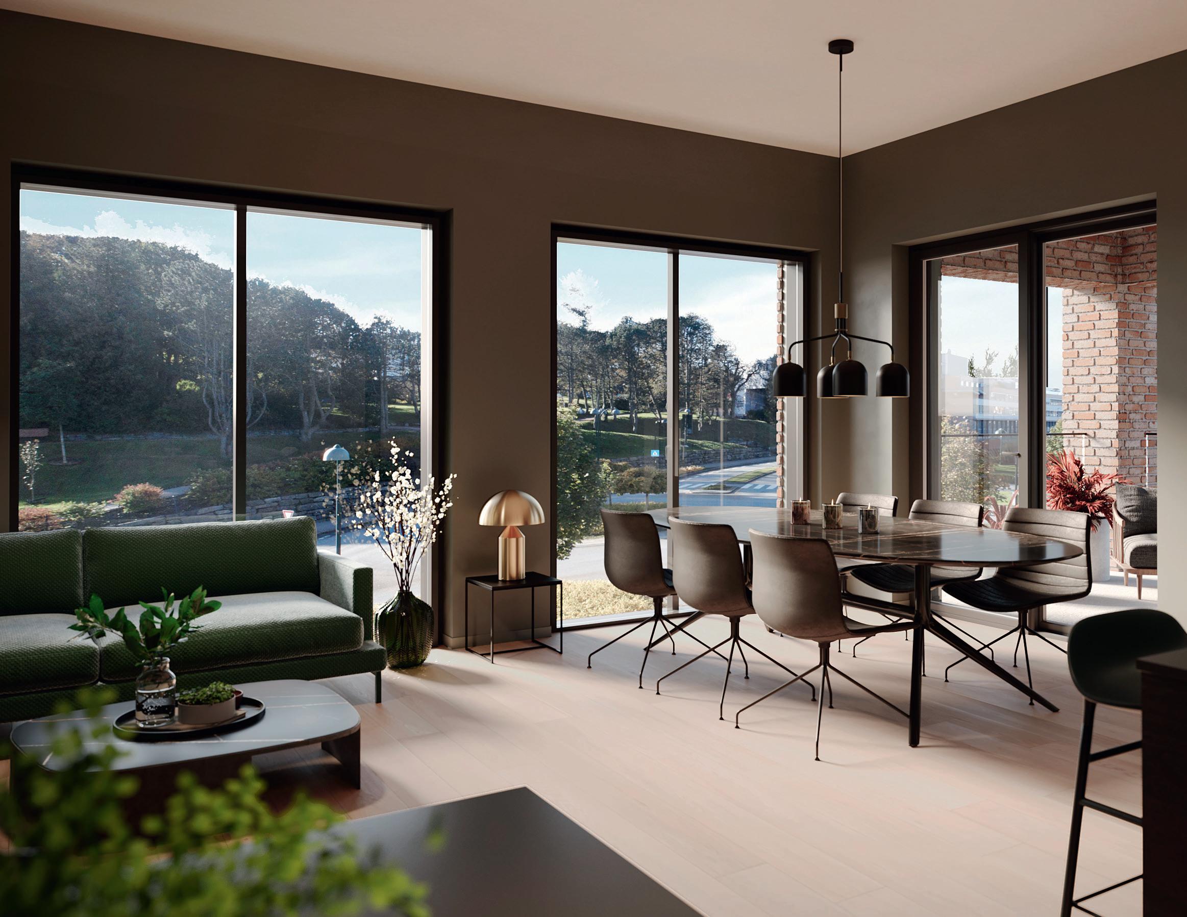 Mørkere interiør og dypere farger kommer særlig til sin rett i rom med store vindusflater. Det organiske og dempede uttrykket er sofistikert og inviterende. Flere av leilighetene har samme utførelse på kjøkkenet som illustrert under. Alle kjøkken leveres av Svane Kjøkkenet.