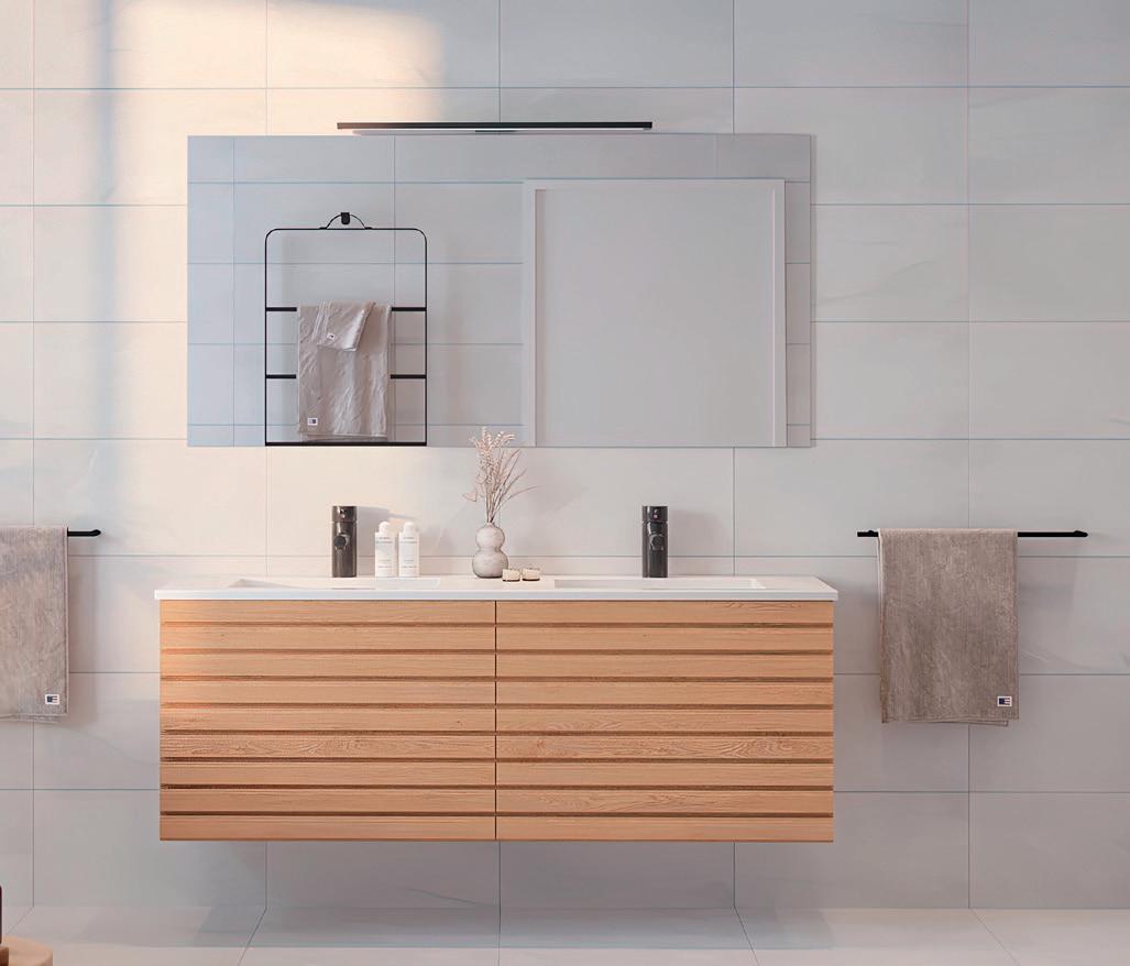 Alle boligene får badromsmøbler fra Svane Kjøkkenet. Her vises Massiv eik som gir en naturlig og klassisk stemning. Med vannrett træstruktur får badet en naturlig stemningsfylt glød, og virker riktig godt i samspill med flisene på vegg og gulv.