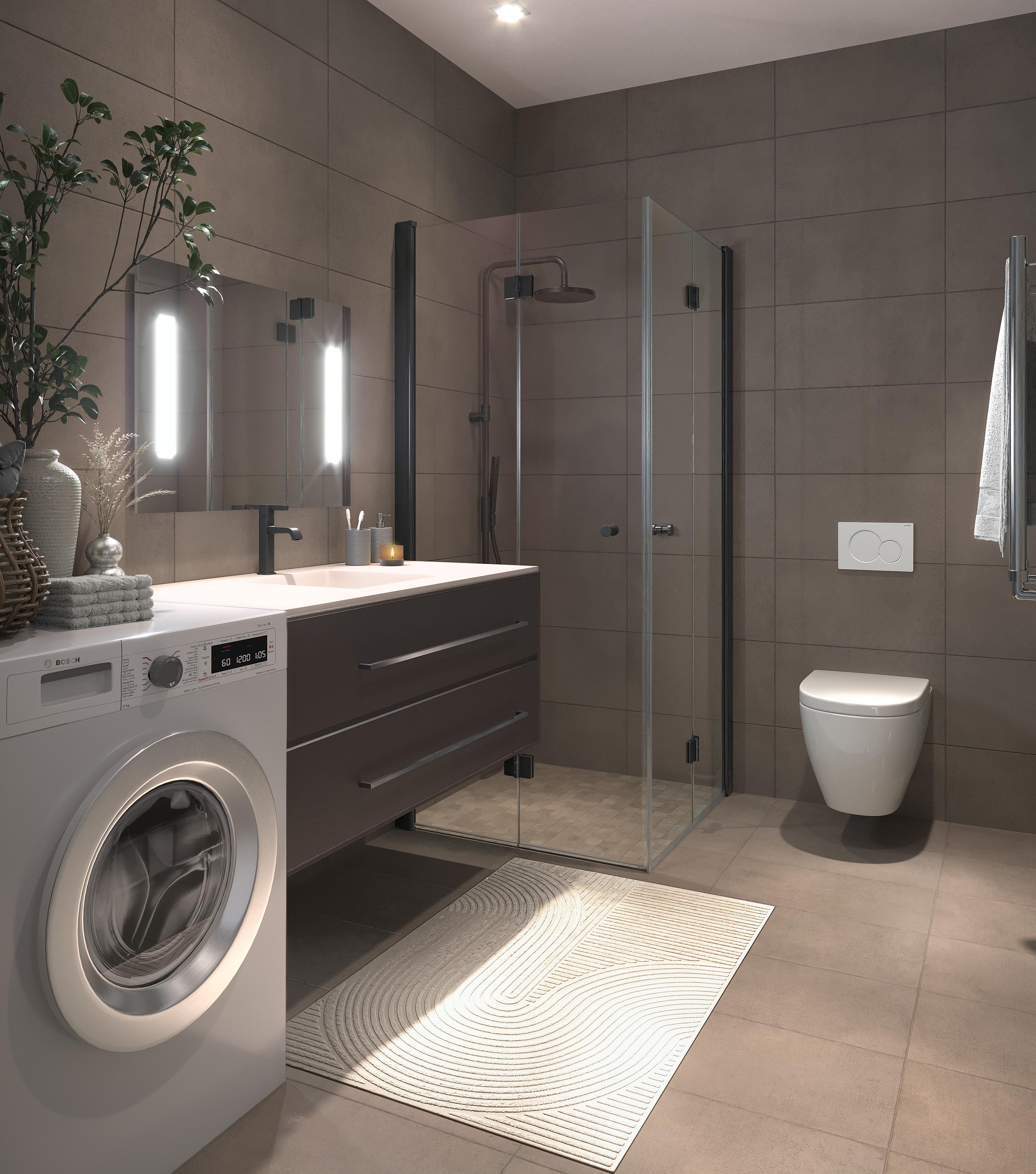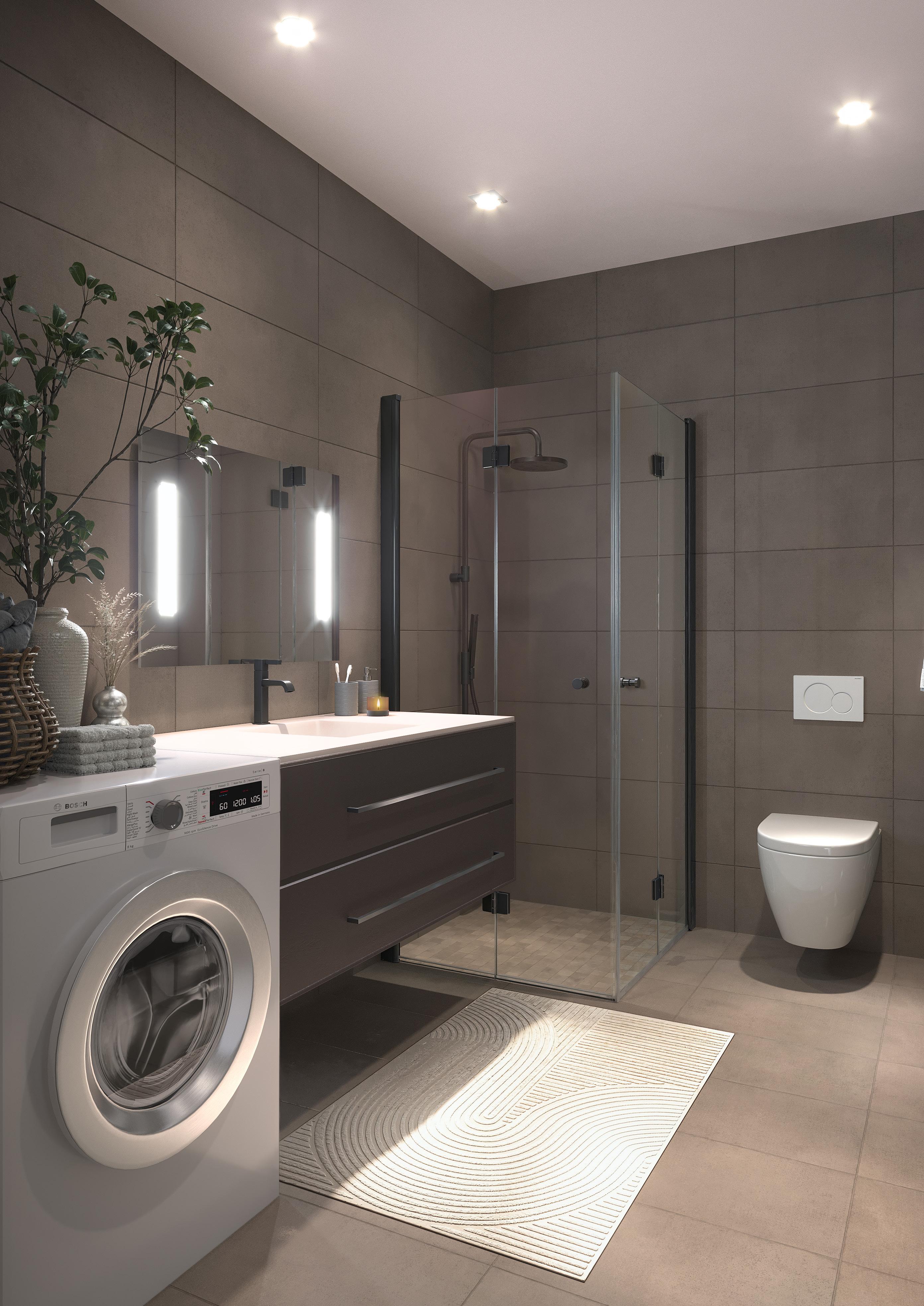 Baderomsinnredning fra Linn Bad eller tilsvarende, se egen tegning for hver leilighet. Kan velges fritt mellom 3 stk fronter i hvit, grå og wood Det er avsatt plass til en vaskesøyle (vaskemaskin, tørketrommel).
