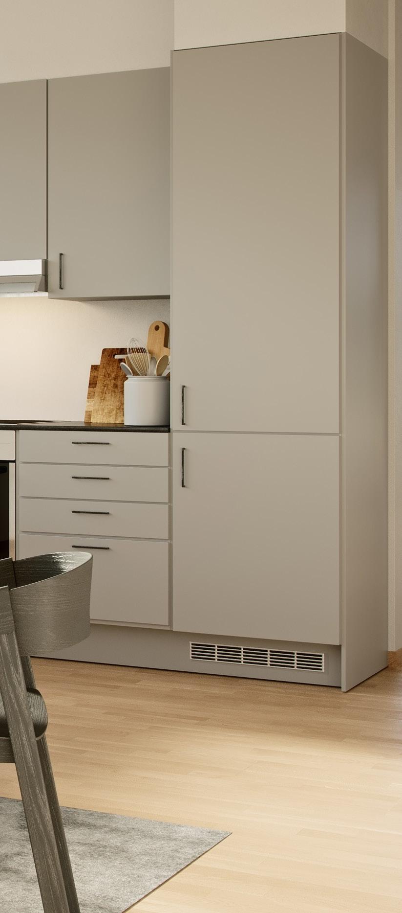 Hvitevarer er ikke inkludert i leveransen i standard leil, men følges med i Premium leil. Nedforing mellom overskap og himling i gips males i samme farge som vegg.