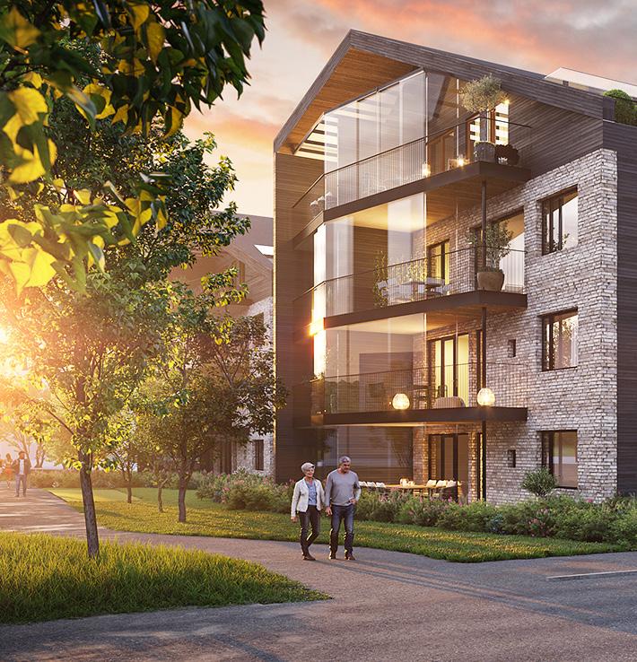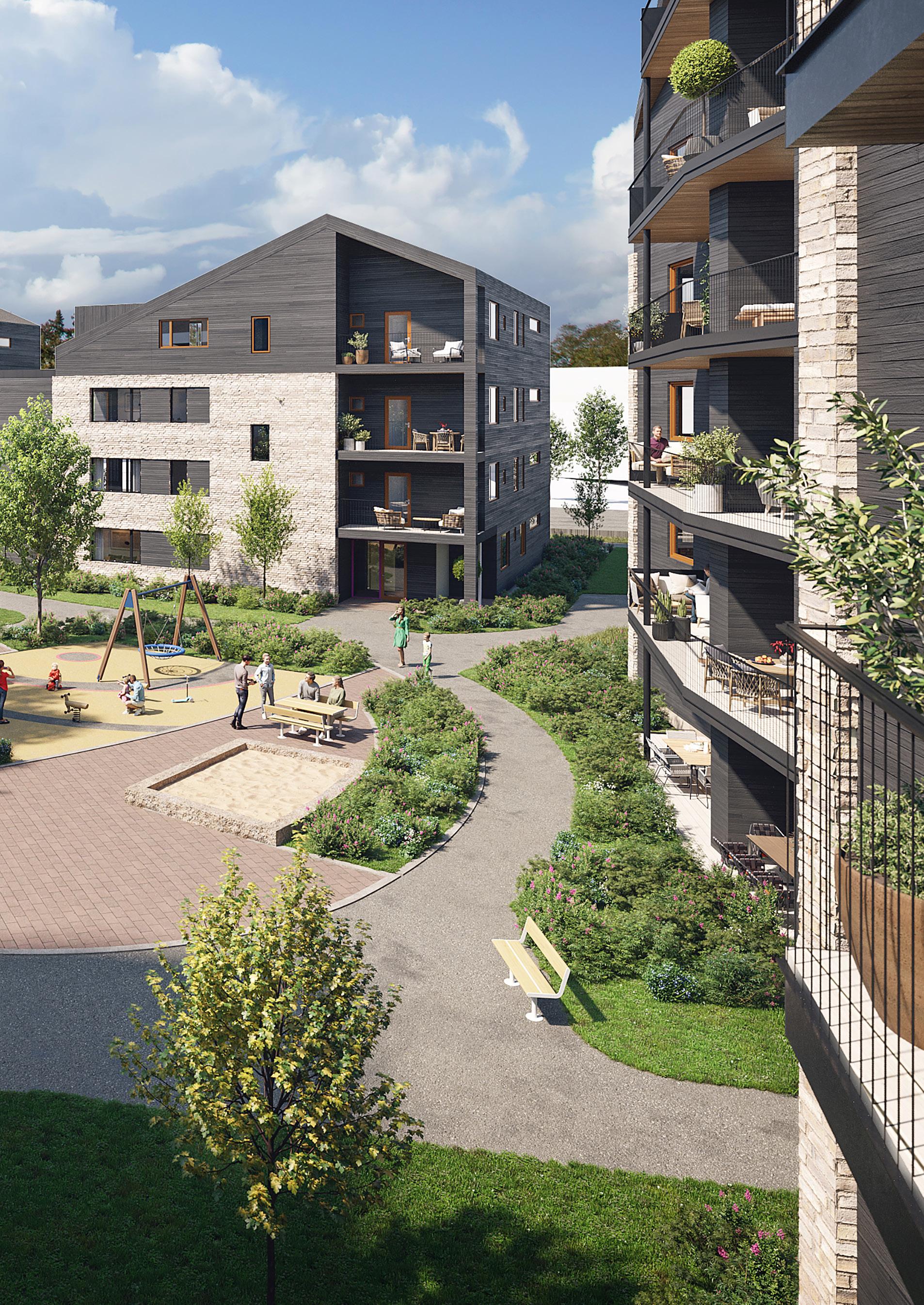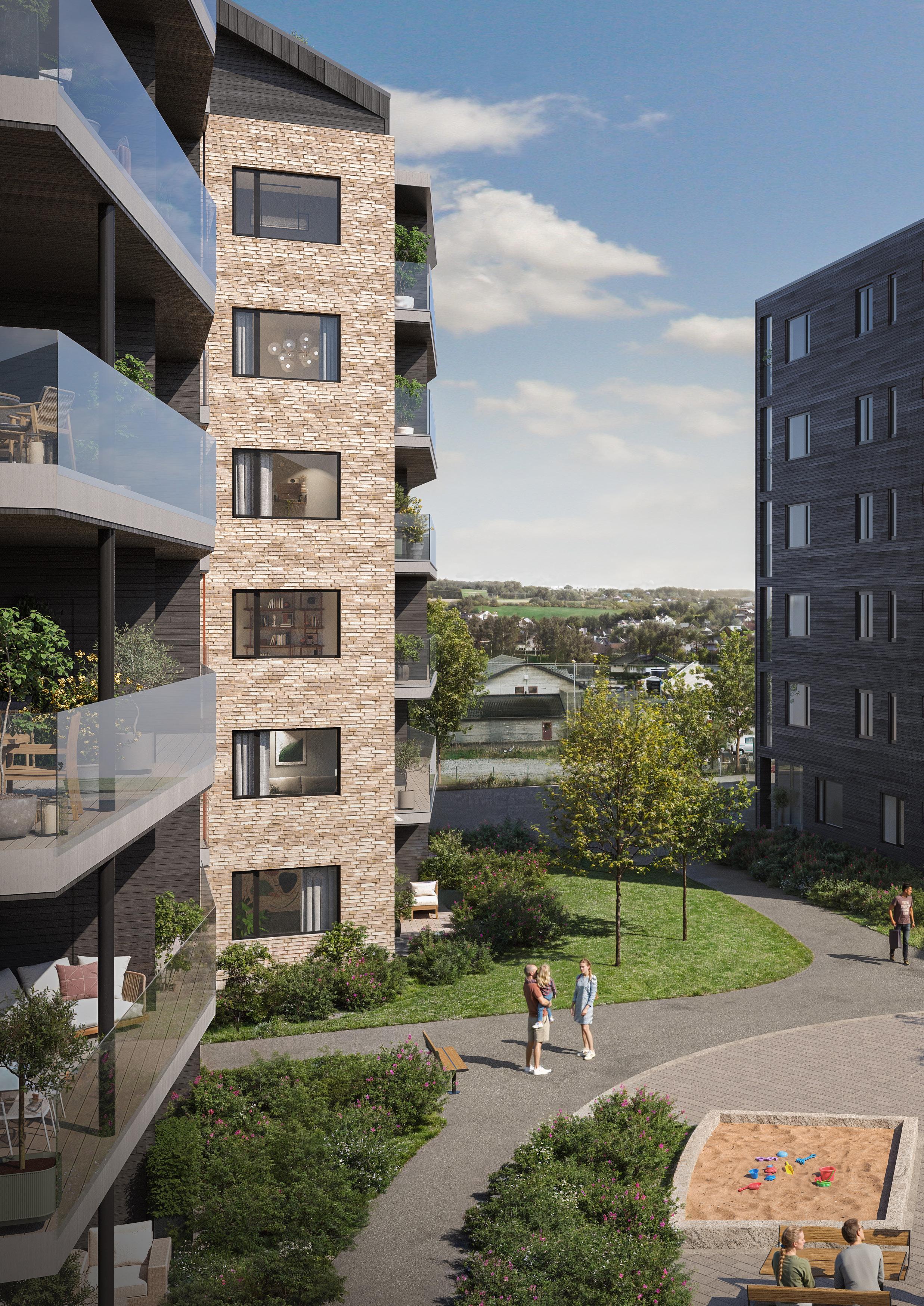 Utomhus vil det bli en frodig beplanting med trær og busker og grøntområder med gress. Mellom byggene vil det være asfaltert gangvei med steinlagte soner med lekeapparater og sitteplasser som passer perfekt for barn, barnebarn og voksne. Ikke minst får alle leiligheter romslige og vestvendte balkonger. Meierigården blir sin egen lille idyll midt i smørøyet på Nærbø.