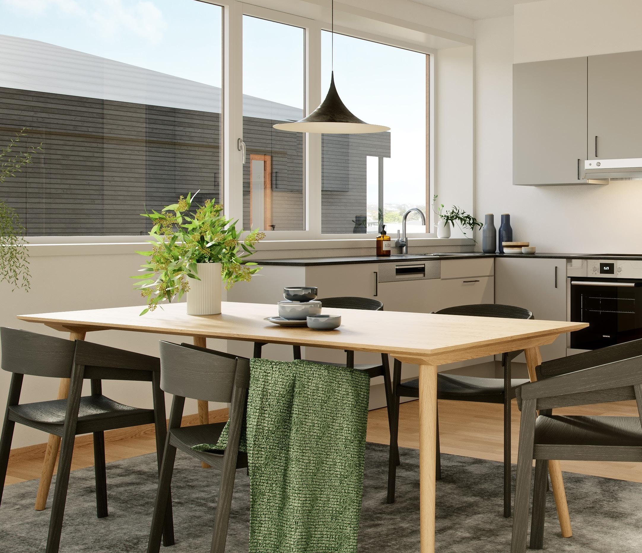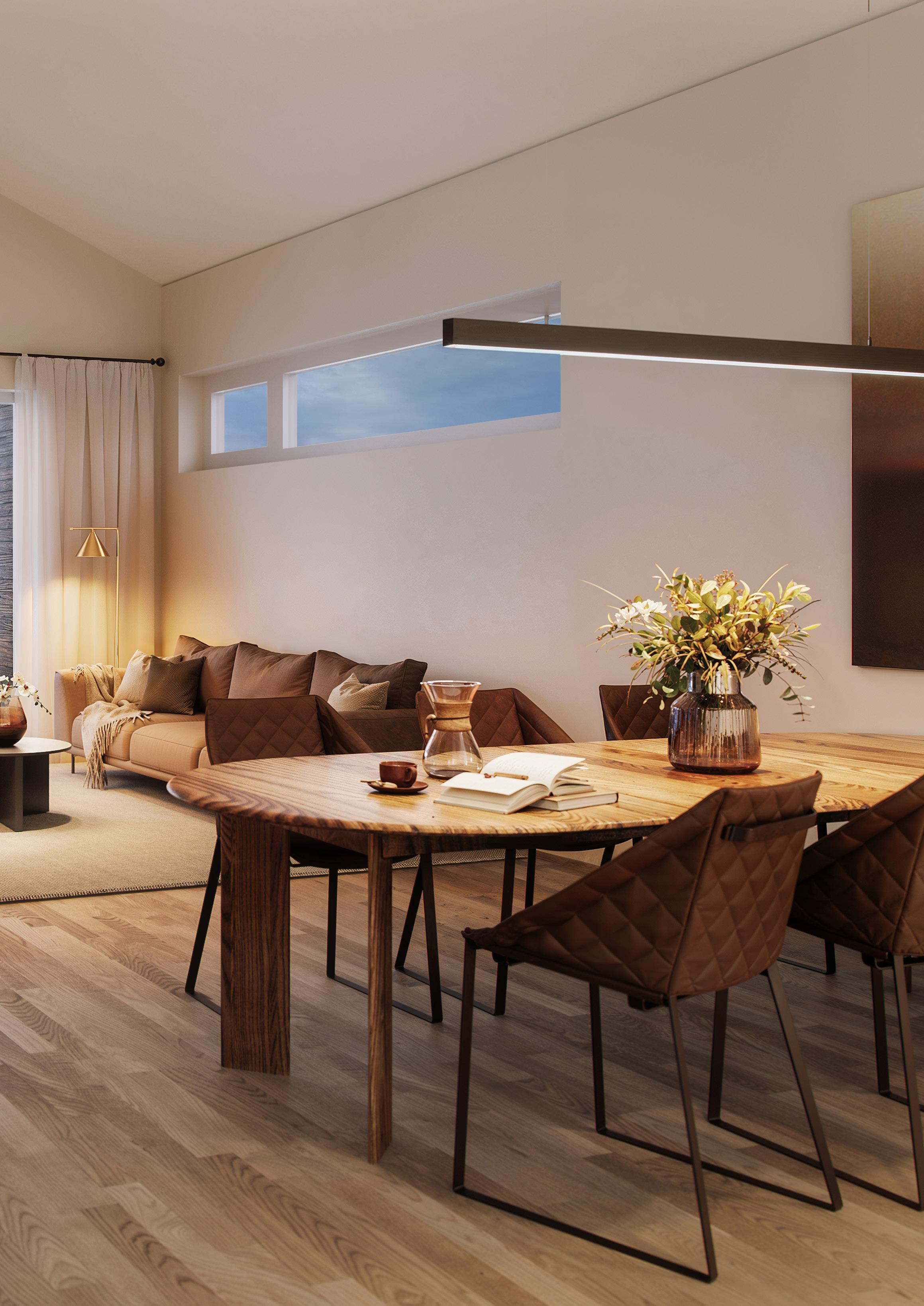 Her får du et hjem med godt inneklima, takket være balansert ventilasjon, solid isolasjon og energieffektiv oppvarming – noe som også gir lavere strømutgifter.