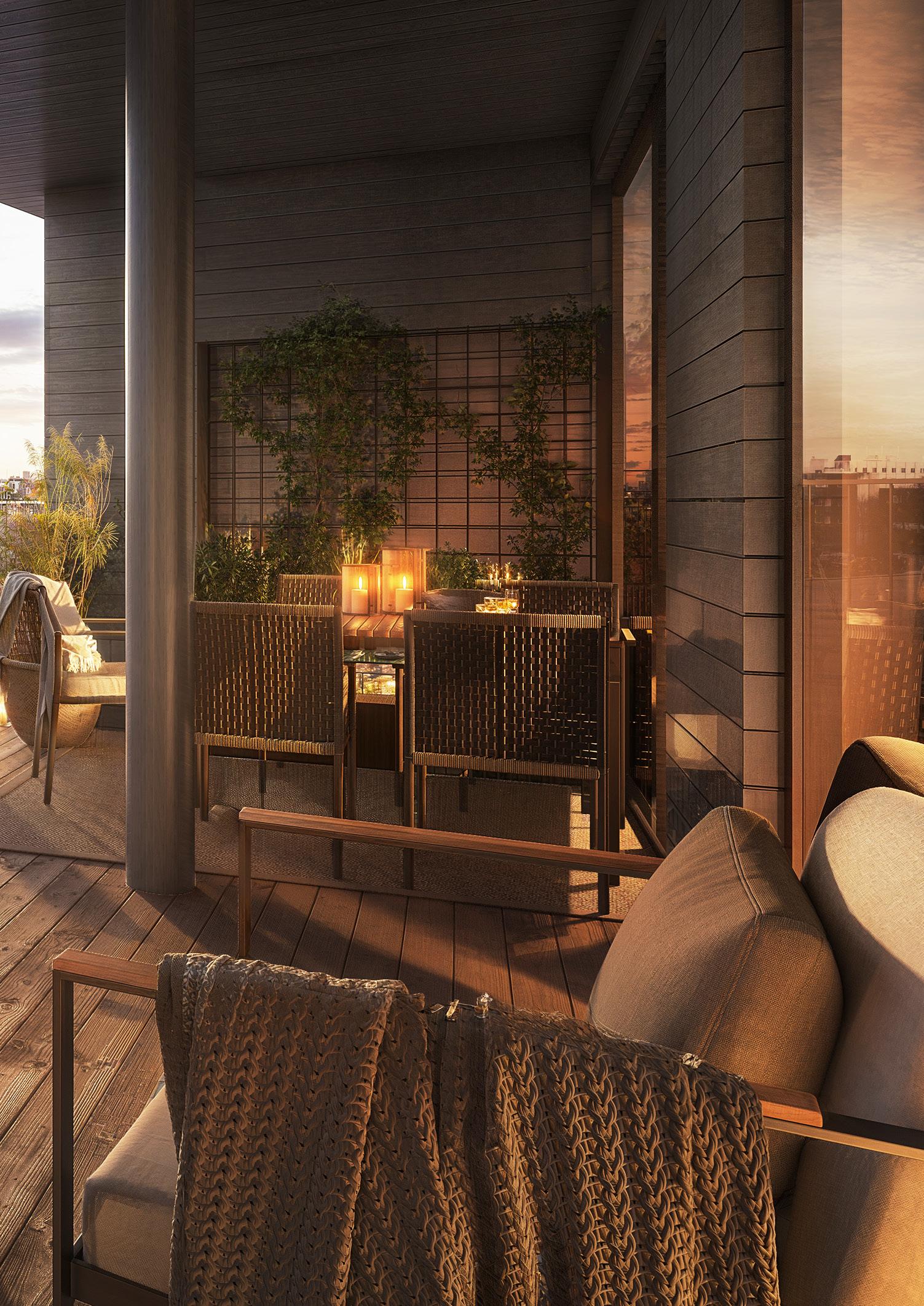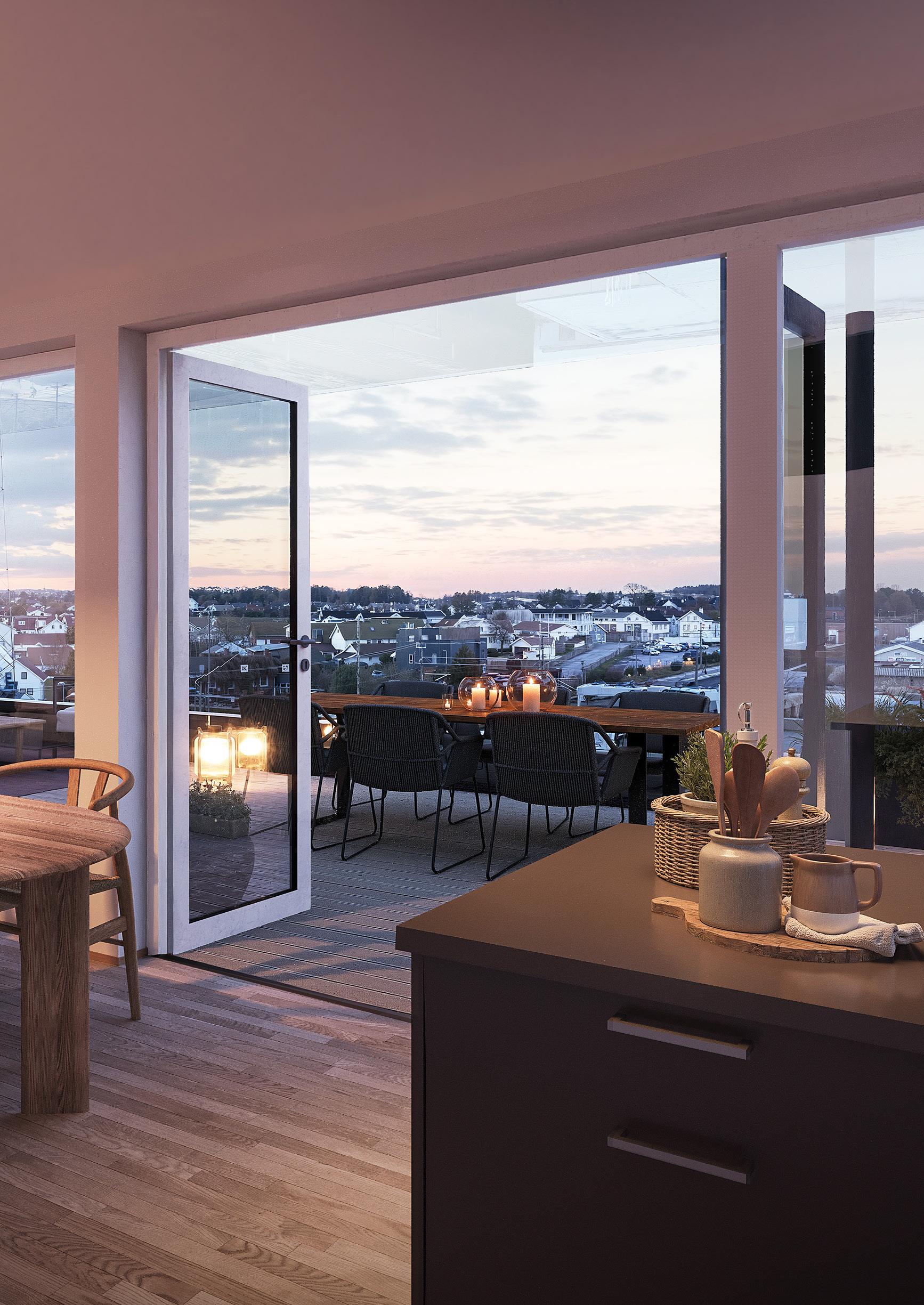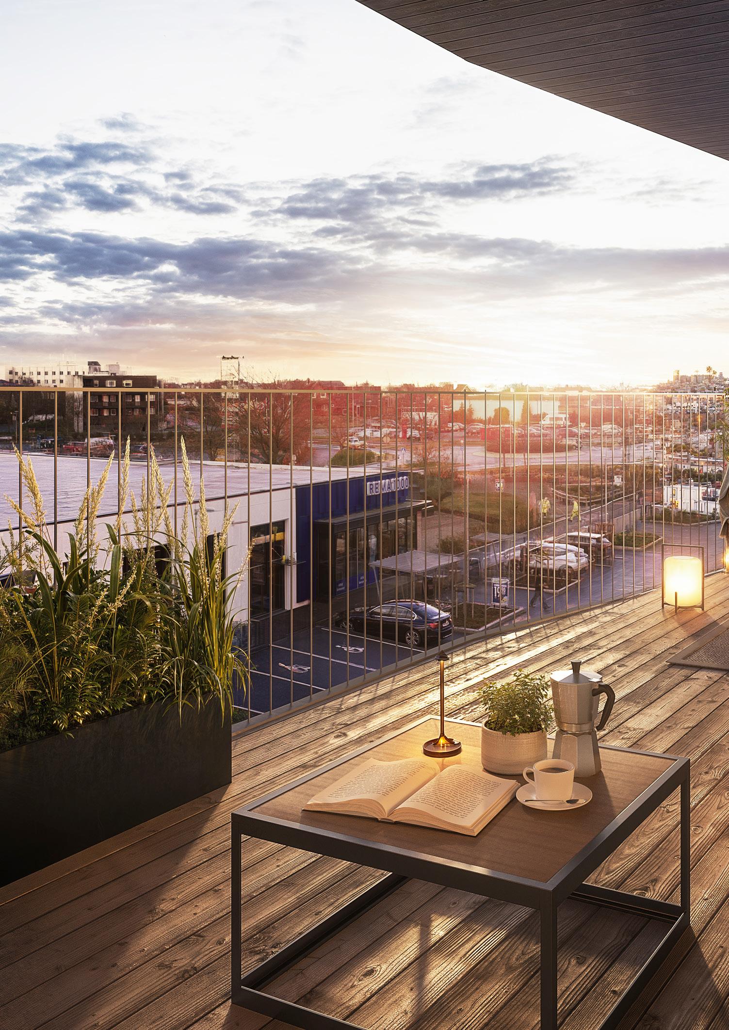 Det er minimal nivåforskjell mellom innvendig gulv og balkong. Balkonger i betong leveres med plattinger av tre. Rekkverket på terrasser består av metallprofiler lakkert i RAL og glassrekkverk der dette er påkrevd.