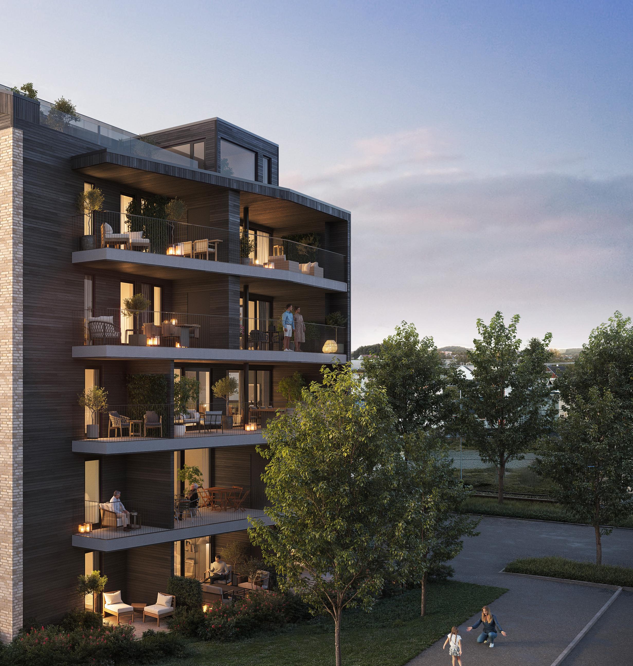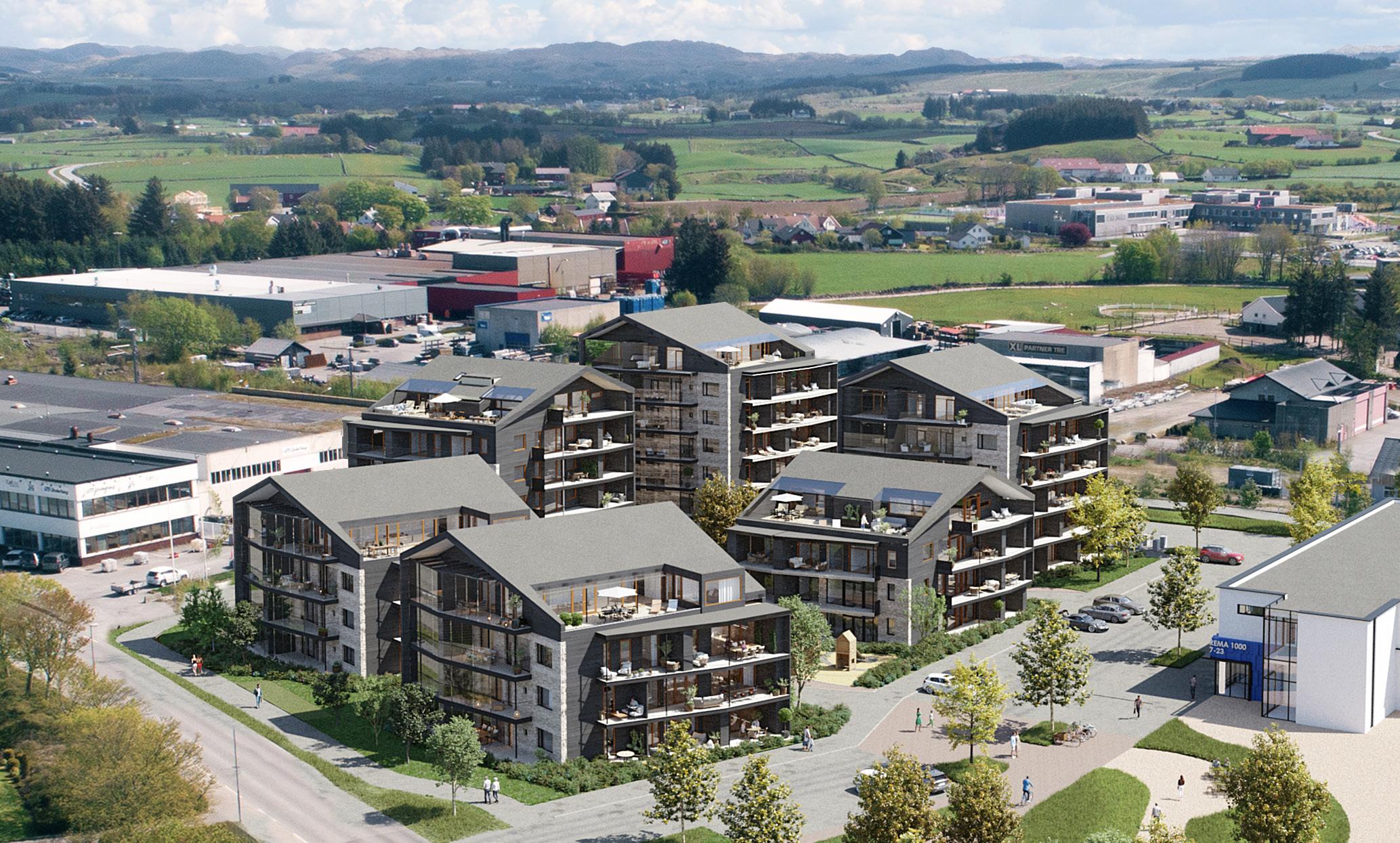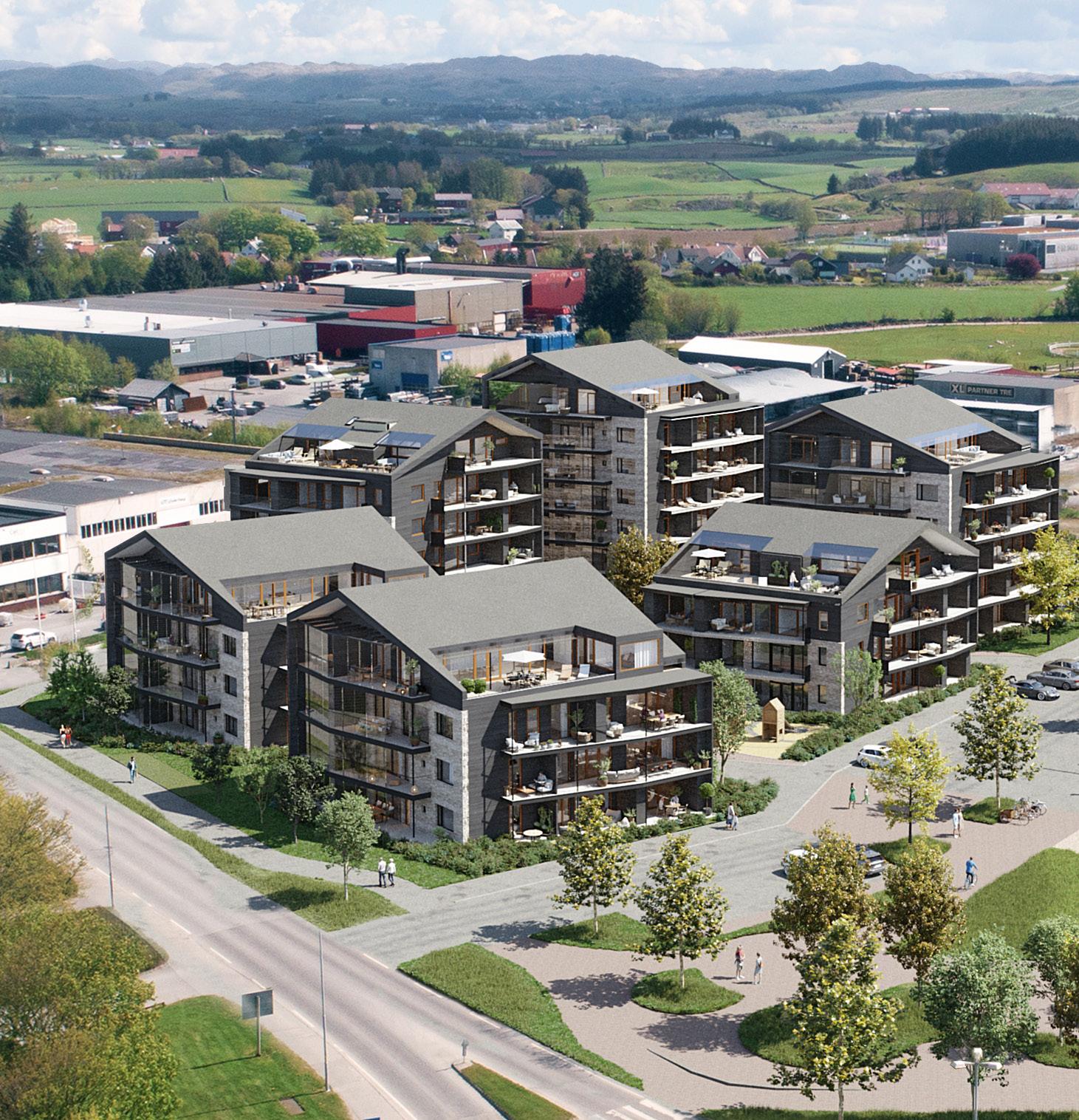 På den gamle Meieritomta har vi tegnet et prosjekt som består av til sammen 6 bygg som danner et lunt felles hagerom for beboerne. Fasadene består av en kombinasjon av en lys varm teglstein og svartmalt trepanel, som gir variasjon og spill i fasadene. Fordi byggene har skråtak og varierer i høyde, danner de en fin silhuett som kontrast til det flate Jærlandskapet. Her er leiligheter i alle størrelser, med solrike balkonger og terrasser. De aller fleste leilighetene har lys og utsikt fra minst to sider, og fra de øverste etasjene ser man helt til havet.