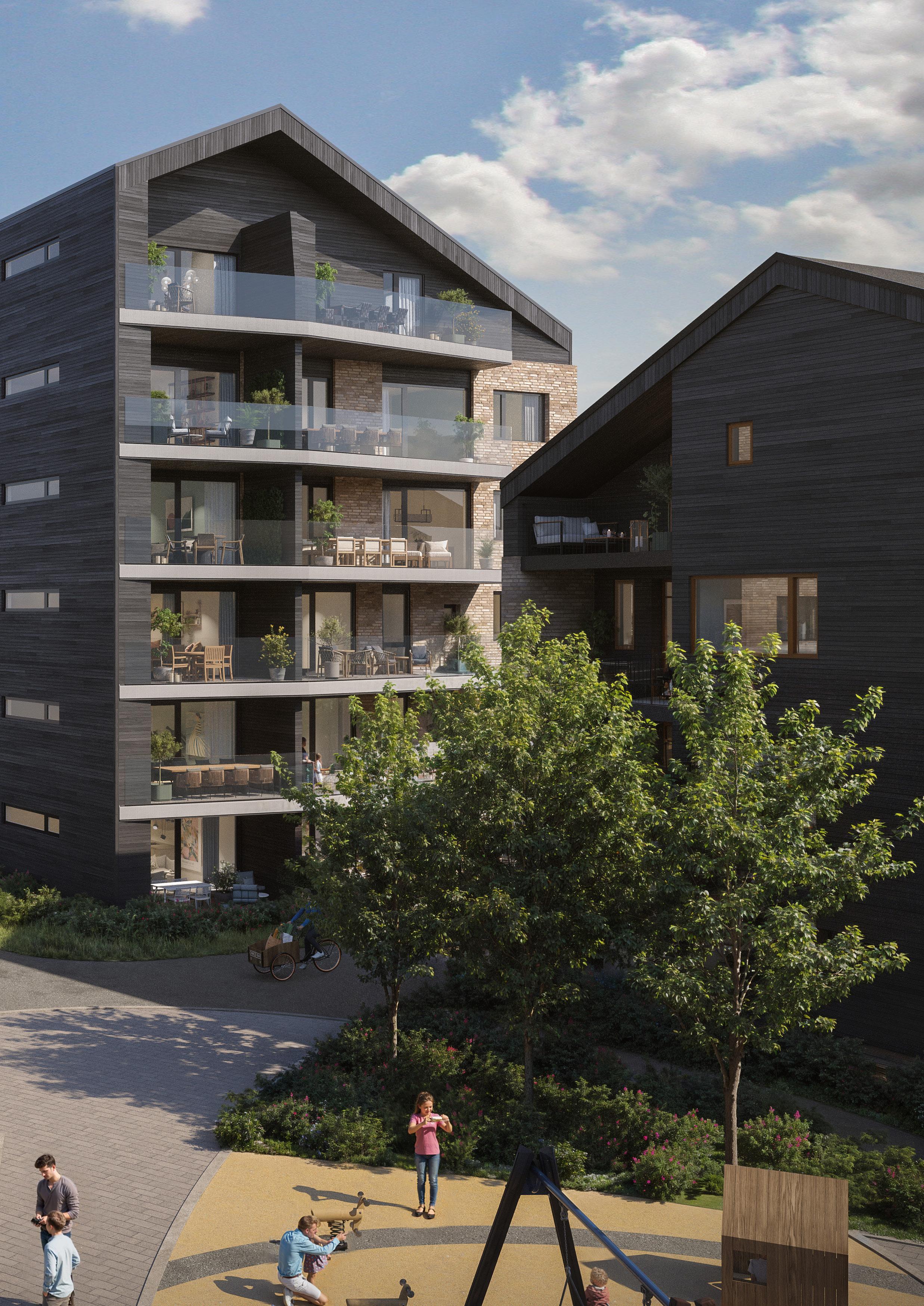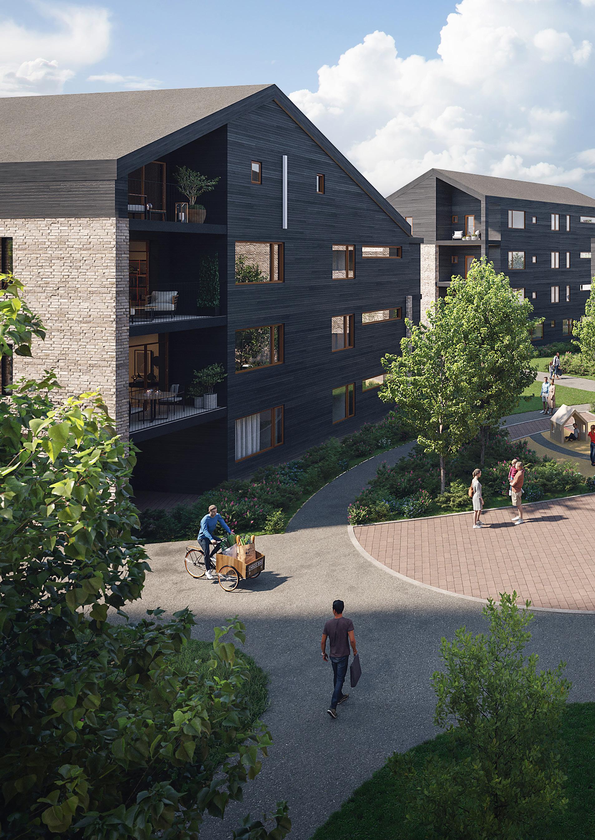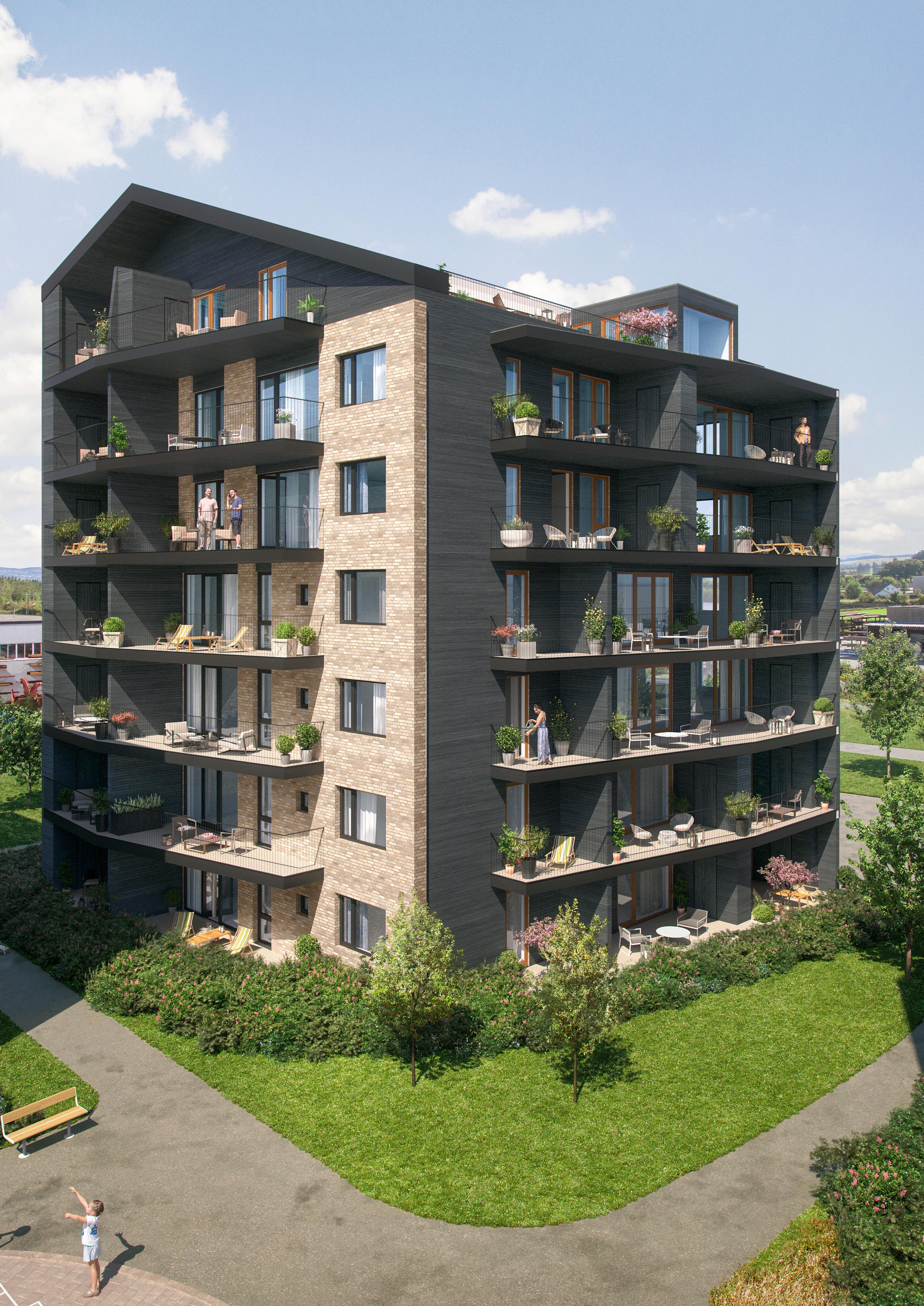 På den gamle Meieritomta har vi tegnet et prosjekt som består av til sammen 6 bygg som danner et lunt felles hagerom for beboerne. Fasadene består av en kombinasjon av en lys varm teglstein og svartmalt trepanel, som gir variasjon og spill i fasadene. Fordi byggene har skråtak og varierer i høyde, danner de en fin silhuett som kontrast til det flate Jærlandskapet. Her er leiligheter i alle størrelser, med solrike balkonger og terrasser. De aller fleste leilighetene har lys og utsikt fra minst to sider, og fra de øverste etasjene ser man helt til havet.