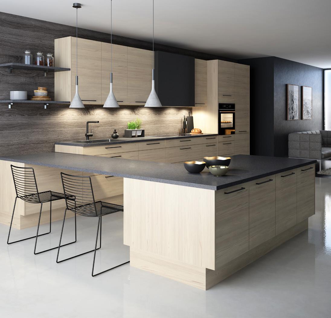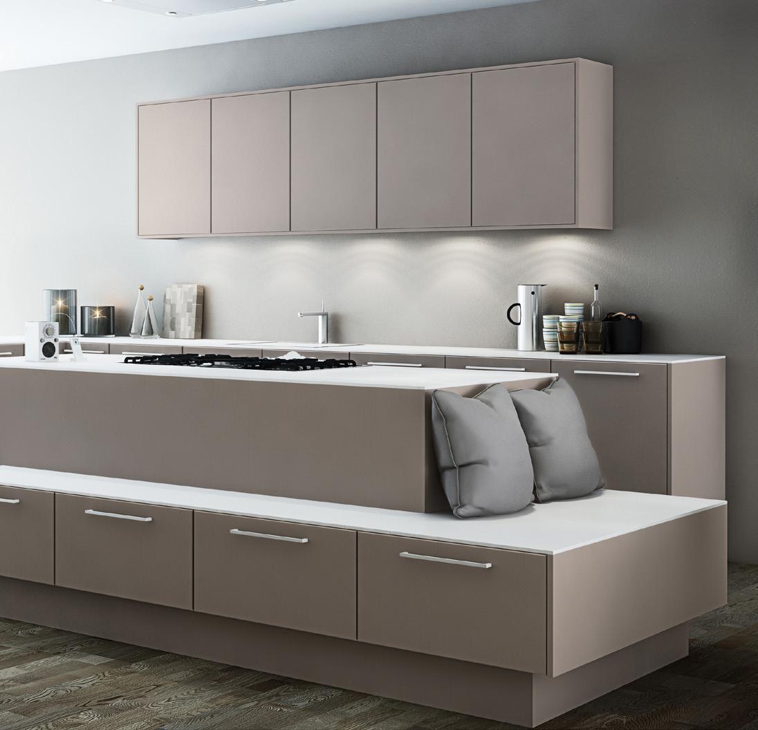 I tillegg kan du velge fritt blant rundt 35 farger og teksturer for laminatbenkeplater. Underlimt vask er standard, og kjøkkenet leveres med LED-lyslist under overskapene for å skape en innbydende atmosfære.