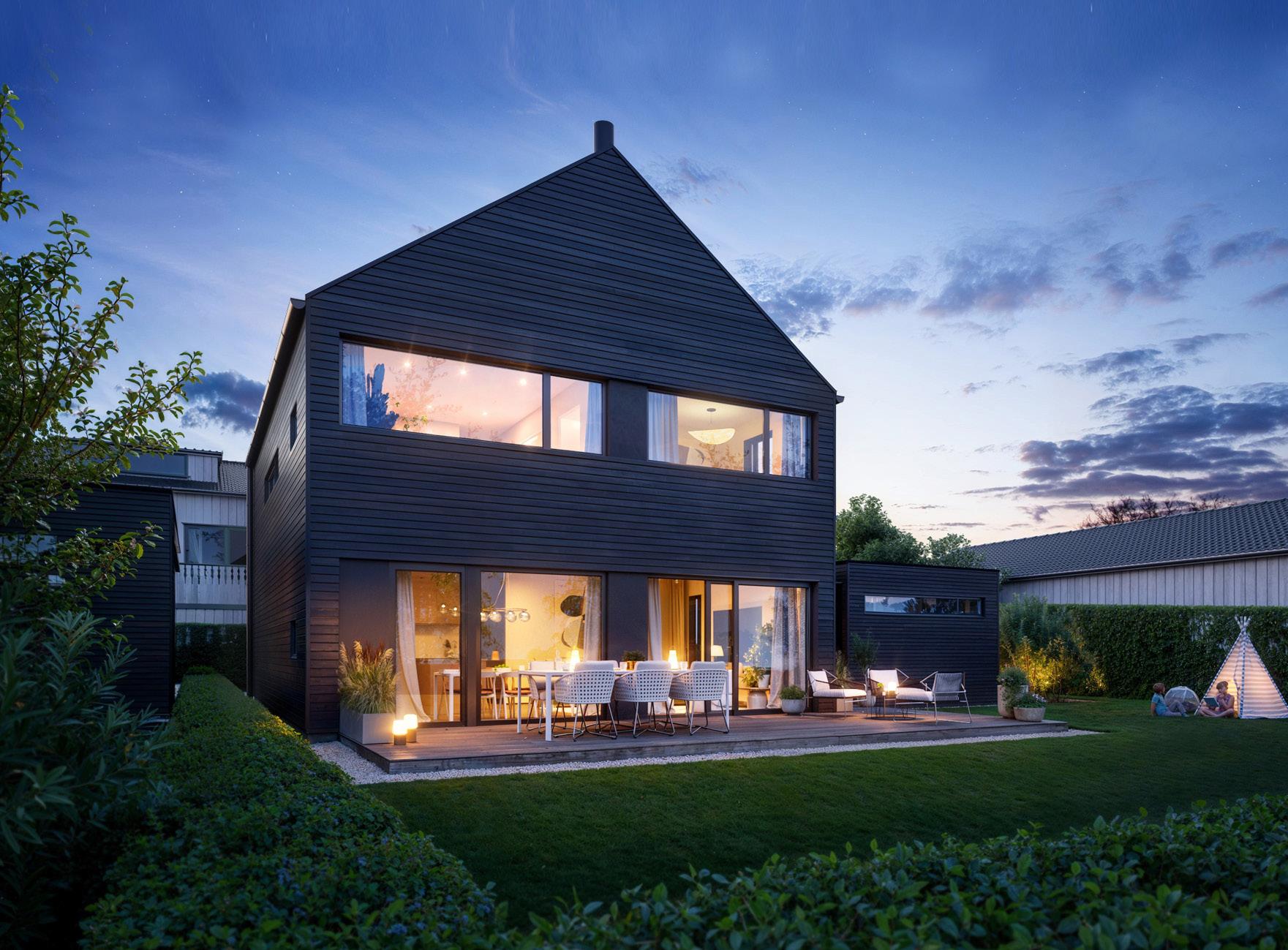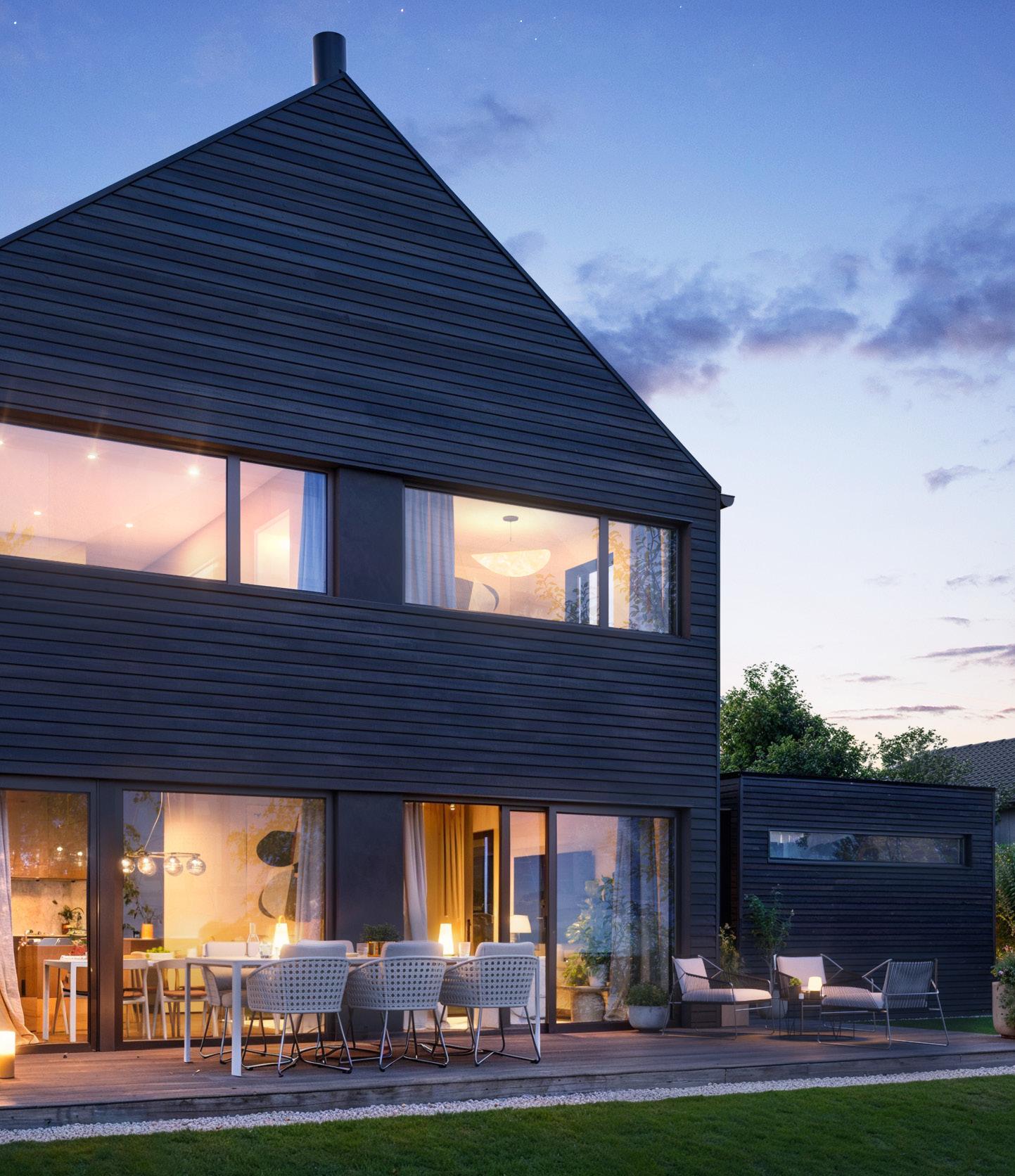 Huset blir kledd med 19x148 dobbelfalset kledning, beiset i sotgrå. Terrasser med 28x120 terrassebord imp. Innvendig gips blir malt i fargen «Space». NorDan trevinduer NCS 8500N sort. Hvite, slette easy innvendige dører. Huset leveres med stålpipe, uten peis/innsats.