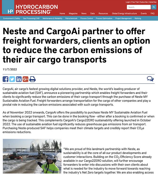 READ THE ARTICLE Neste and CargoAi Launch Partnership Offering Freight Forwarders and Their Clients an Option to Reduce the Carbon Emissions of Their Air Cargo Transports 8 November 2022