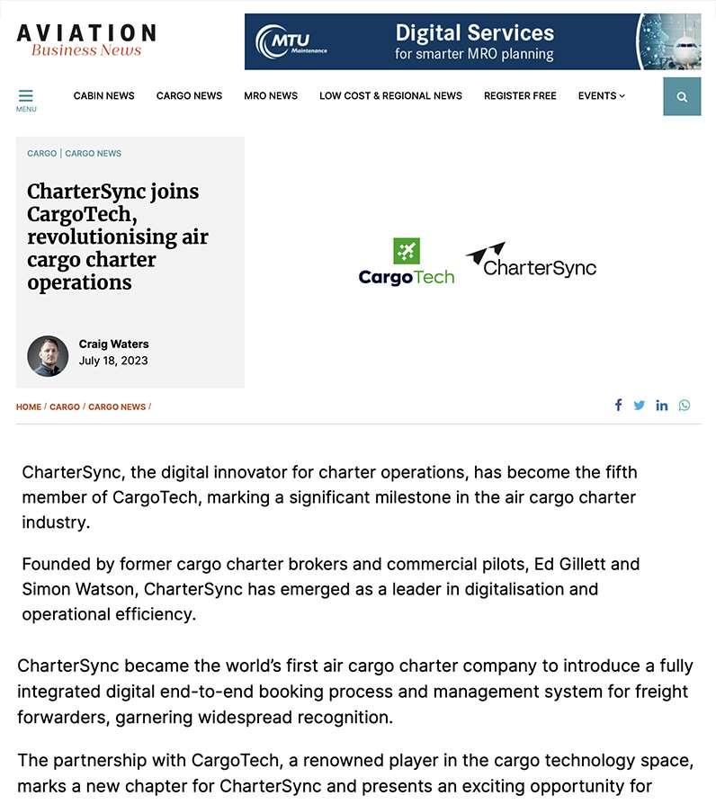 18JULY2023 READTHEARTICLE CharterSyncjoinsCargoTech, revolutionisingaircargo charteroperations