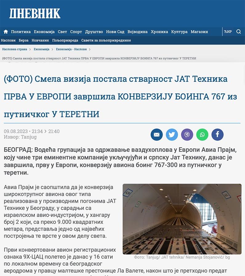 09 AUGUST 2023 READ THE ARTICLE "Jat Tehnika" radila na boingu koji je prvi u Evropi konvertovan iz putničkog u teretni