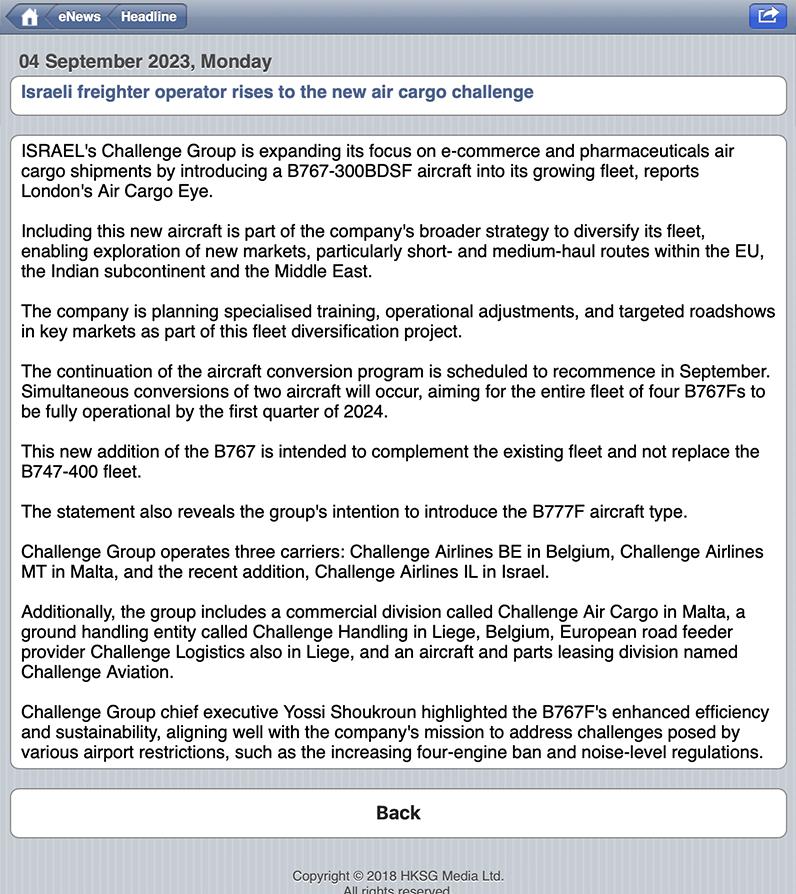 03 SEPTEMBER 2023 READ THE ARTICLE Israeli freighter operator rises to the new air cargo challenge