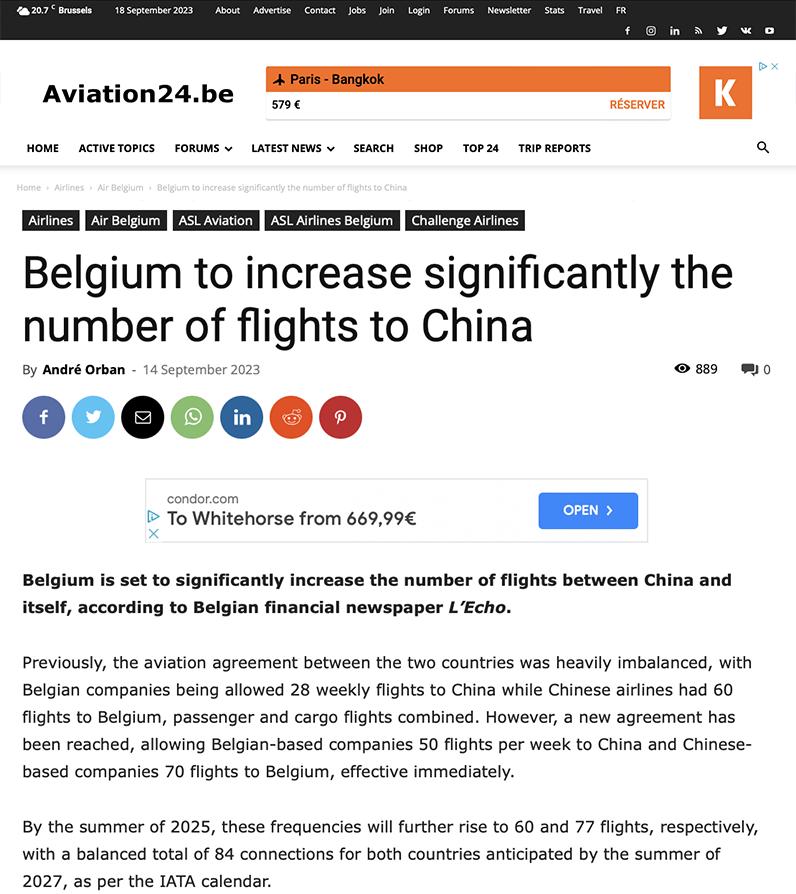 14 SEPTEMBER 2023 READ THE ARTICLE Belgium to increase significantly the number of flights to China