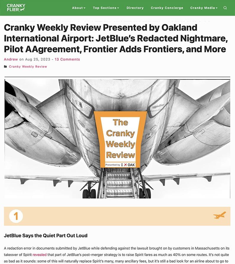 Cranky Weekly Review Presented by Oakland International Airport: JetBlue’s Redacted Nightmare, Pilot AAgreement, Frontier Adds Frontiers, and More